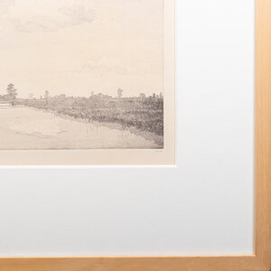 Reinder Homan (Smilde (Midden-Drenthe), 1950), 'Het Bruggetje', 1978. Ets oplage van 40, in houten lijst met passe-partout. Zwart-wit afbeelding van een waterloop met bruggetje. Signatuur linksonder. Datering: 1978. Conditie: verkleuring ets, lichte gebruikssporen lijst. Afmetingen lijst: 41,5 x 47,5 cm; beeldvlak: 19 x 26 cm.