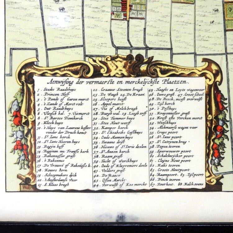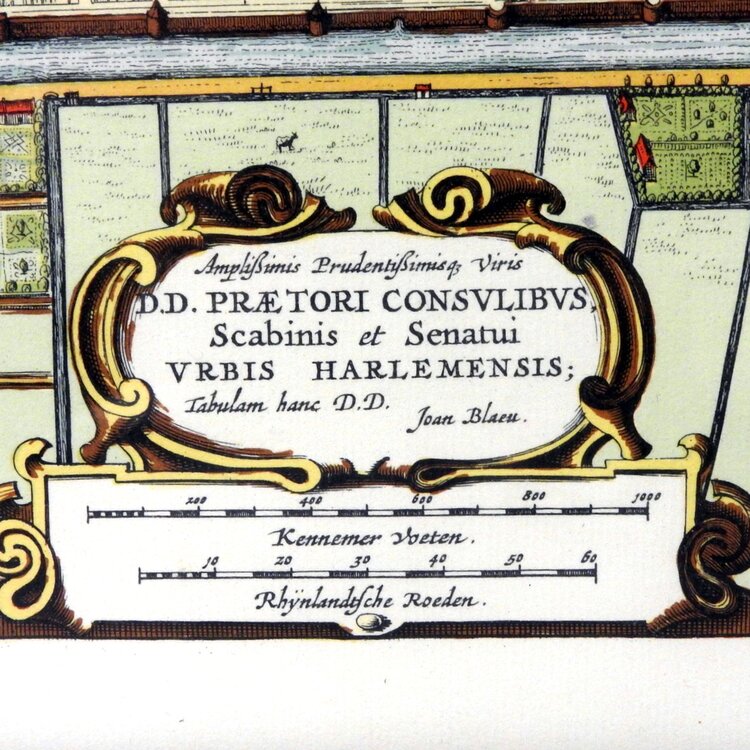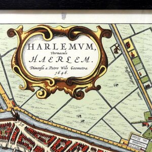 Reproductie van een kaart van Haarlem. De originele kaart, getiteld "Harlemum, Vernacule Haerlem", is een kopergravure uit 1646, uitgegeven door de Nederlandse cartograaf Joan Blaeu. De kaart toont Haarlem in de 17e eeuw en is met de hand ingekleurd. De reproductie zit in een zwarte lijst achter glas. Datering reproductie onbekend. Conditie: lijst vertoont lichte gebruikssporen. Afmetingen met lijst: H. 53 cm, Br. 63 cm.
