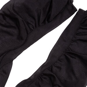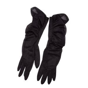 Rodo clutch met twee paar zwarte avondhandschoenen, 20ste eeuw. Zwart leren Rodo clutch met goudkleurige ketting. De binnenzijde is van zwart leer en heeft een klein opbergvakje met spiegel en kammetje. Aan de bovenzijde kan de tas geopend worden via een goudkleurige knoop; Een paar avondhandschoenen van suède (7,5) en een paar van tule. Conditie: gebruikt, slijtage aan de buitenzijde; bij kammetje ontbreken tanden. Afmetingen clutch: ca. 13 x 23,5 x 3,5 cm; hoogte met hengsel 51 cm. Afmetingen handschoenen: ca. 36 x 8 cm, ca. 33 x 8 cm.