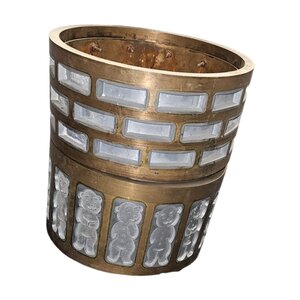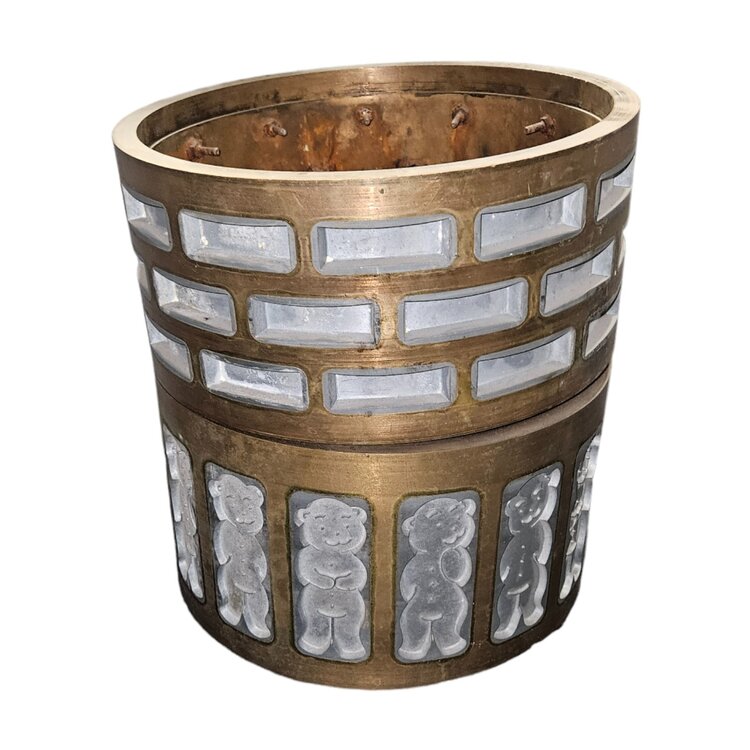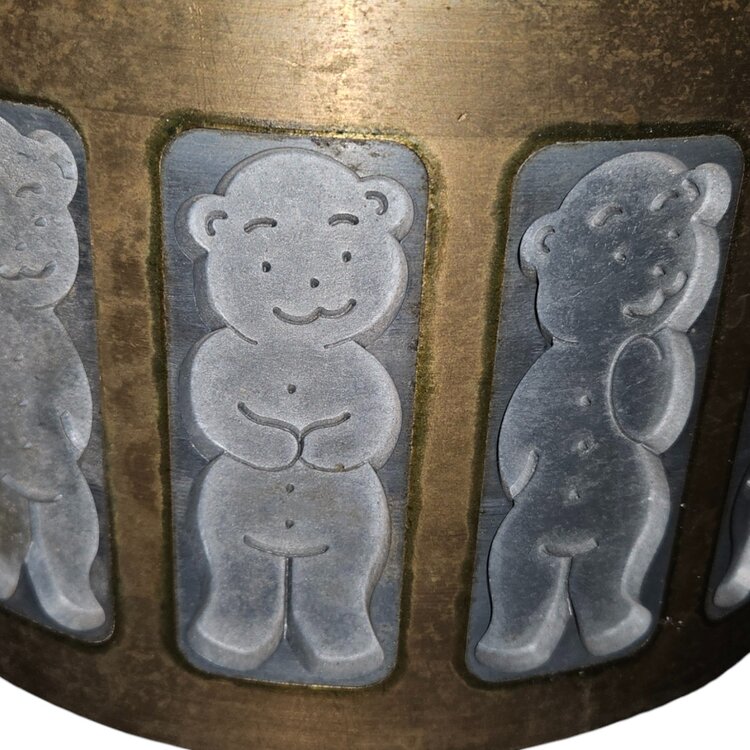 Rol voor biscuitmachine met uitsteekvorm beertjes, 20ste eeuw. Hiermee werden vormen in het deeg gedrukt. Op deze rol zitten vormen voor langwerpige biscuits en beertjes. Conditie: goed, sporen van gebruik. Afmetingen: d. 26.0, h. 27.0 cm.