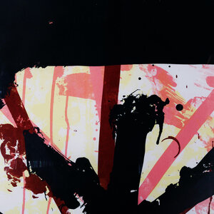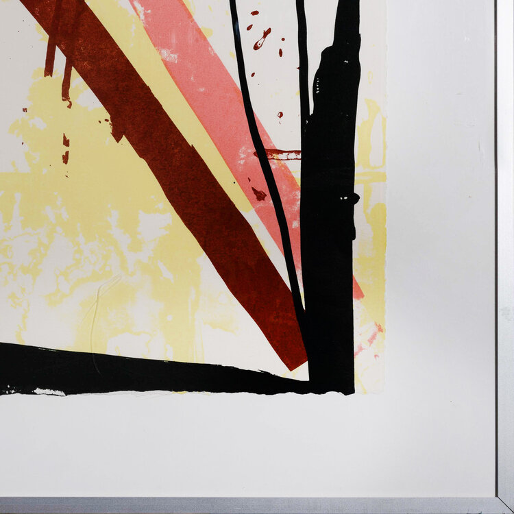 Roland Berning, 'Zonder Titel', 1996. Zeefdruk in metalen lijst met kunststof plaat, oplage 11/25. Het abstracte werk heeft vlakken en strepen in zwart, bruin en roze. Het werk is geplakt op een groter vel. Signatuur rechtsonder. Conditie: vertoont gebruikssporen. Afmetingen incl lijst: ca 121 x 91 cm.