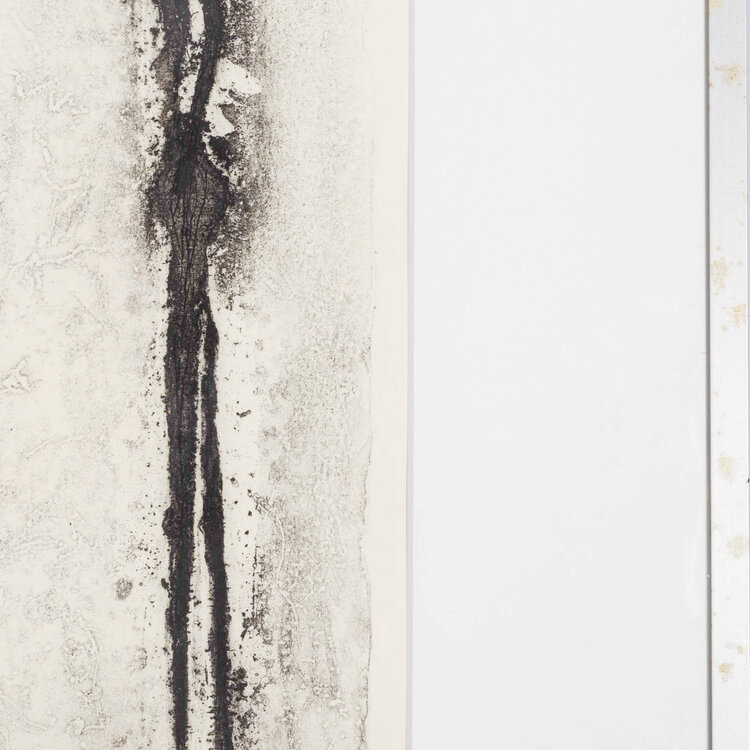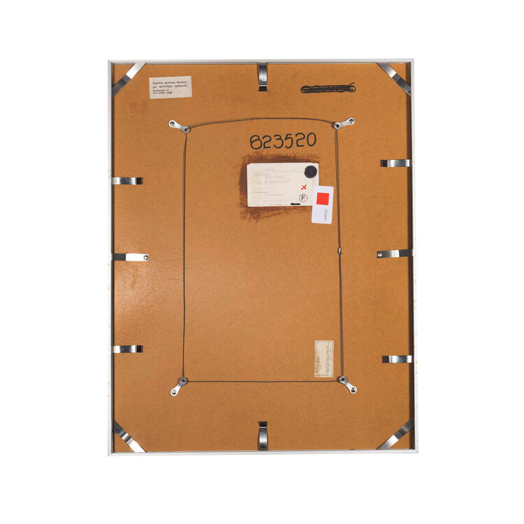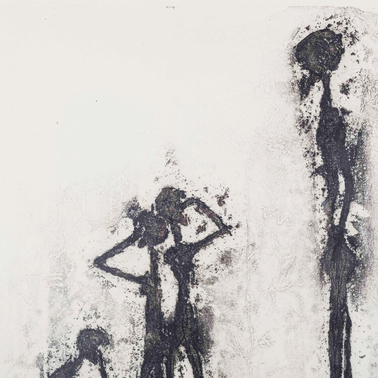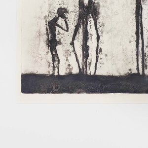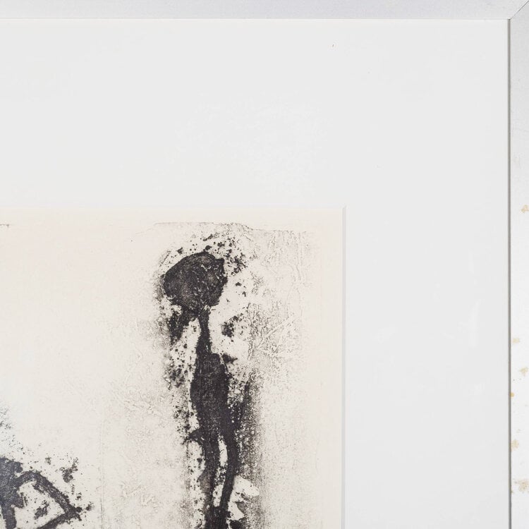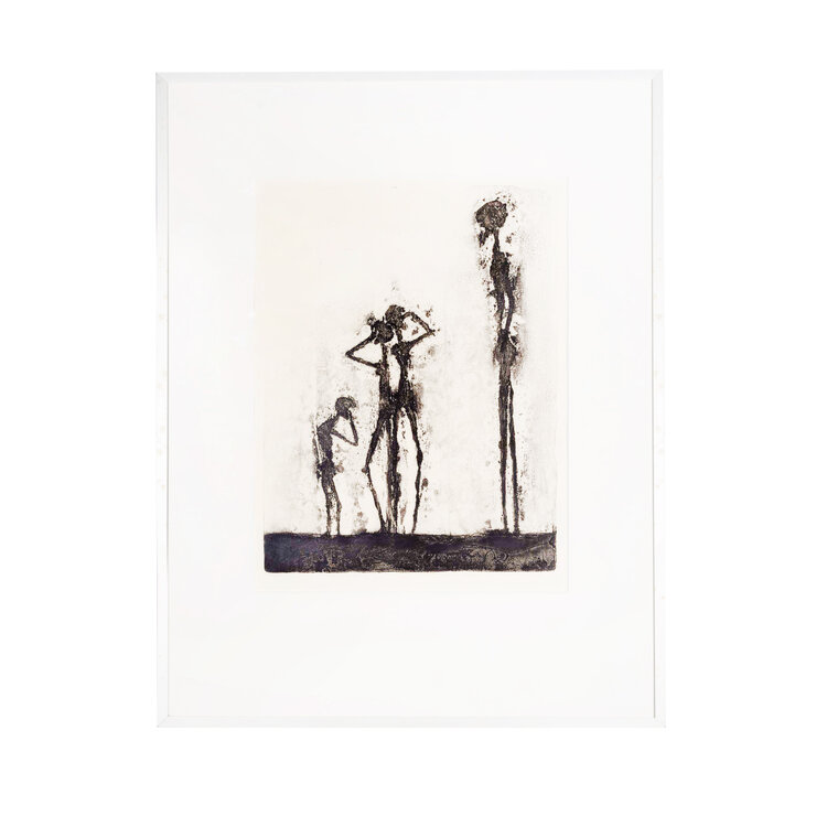 Ronald Medema, 'De geldeters', 1979. Ets/aquatint met passe-partout in metalen lijst met kunststof plaat, oplage 8/35. Afbeelding van vier zwarte figuren. Signatuur rechtsonder. Conditie: papier bobbelt in lijst. Afmetingen incl lijst: ca 66 x 51 cm.