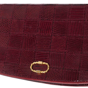 Elegant rood avondtasje met goud-kleurige details en ketting als schouderband. De tas is gemaakt van vierkante vlakken geschubd imitatie leer. Aan de binnenkant is het gevoerd met zachte stof en zit er een opbergvakje met rits. Datering: onbekend. Conditie: nog in mooie conditie, met enkel hier en daar lichte gebruikssporen. Afmeting: 13 x 22 x 2 cm.