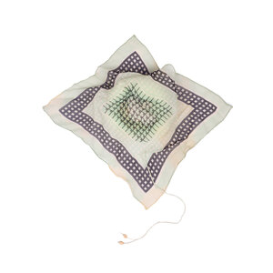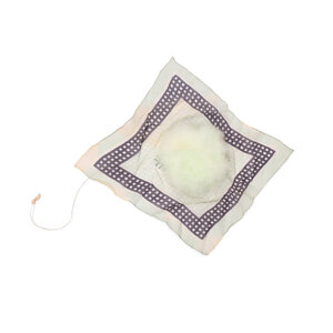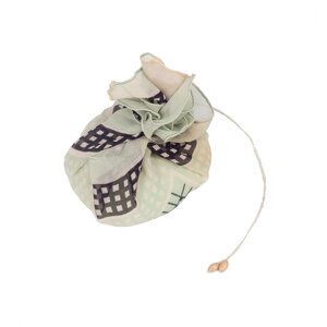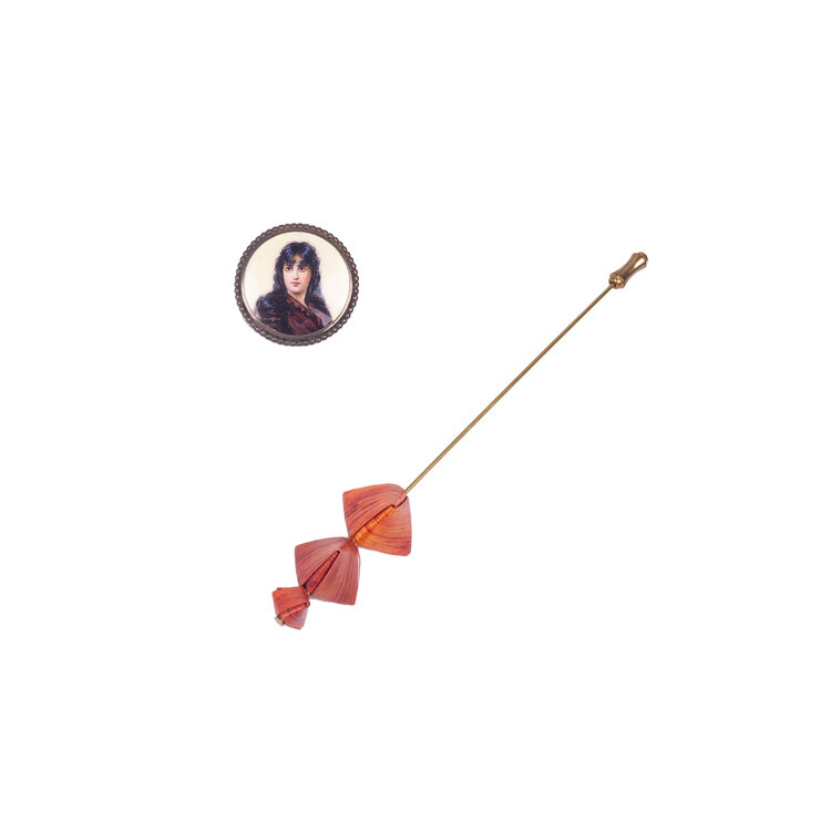 Sachet, speld en broche. Datering 20ste eeuw. Een sachet, bestaande uit een mintgroen doekje met geblokte rand, pompon en touwtje. Het werd mogelijk gebruikt om een aangename geur te verspreiden. Conditie: gebruikssporen, verkleuring. Afmetingen: ca 22 x 24 cm; Een goudkleurige speld met drie oranjebruin-gevouwen vormen gemaakt van bamboe of riet. De speld werd gebruikt voor revers, sjaal of hoed. Conditie: goed. Afmetingen: ca 12 x 1,5 cm; Een broche in Victoriaanse stijl met een portret van een vrouw. Conditie: oxidatie metaal. Afmetingen: ca Ø 2,8 x 0,5 cm.
