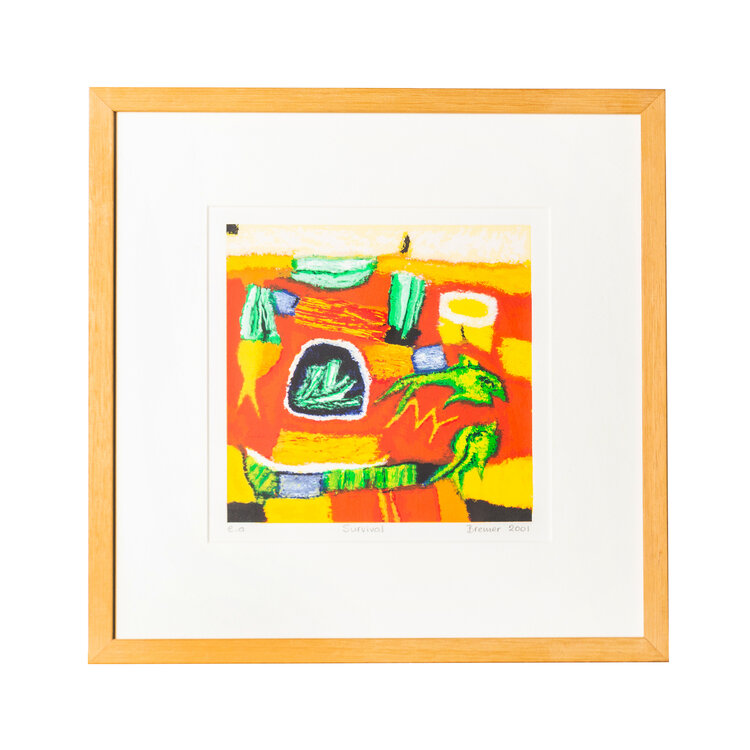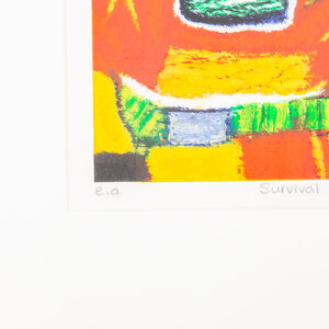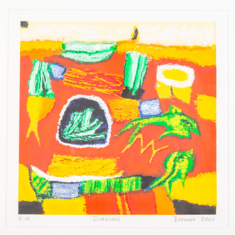 Saskia Bremer, Survival, 2001. Zeefdruk op papier in houten lijst, E.A.. Kleurrijke abstracte voorstelling in rood, geel groen, blauw en zwart. Linksonder in potlood E.A., in midden titel en rechtsonder signatuur en jaartal. Conditie: goed, gebruikssporen aan lijst. Afmeting werk zonder lijst: 20 x 20 cm, incl. lijst: 34 x 34 cm.