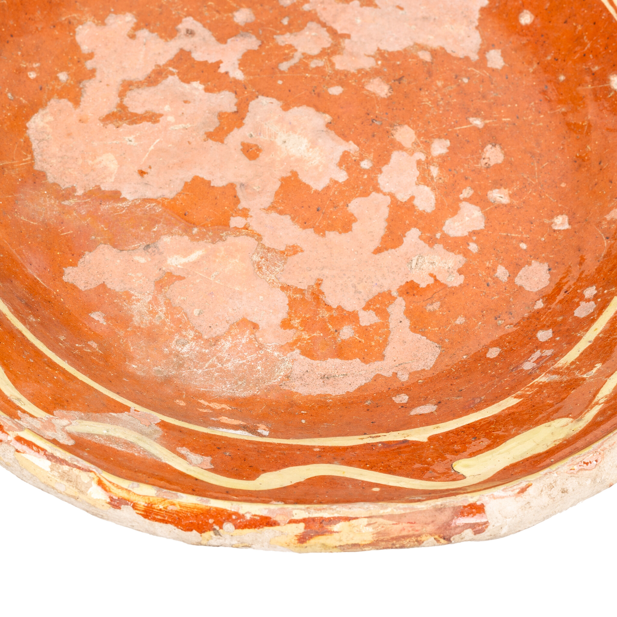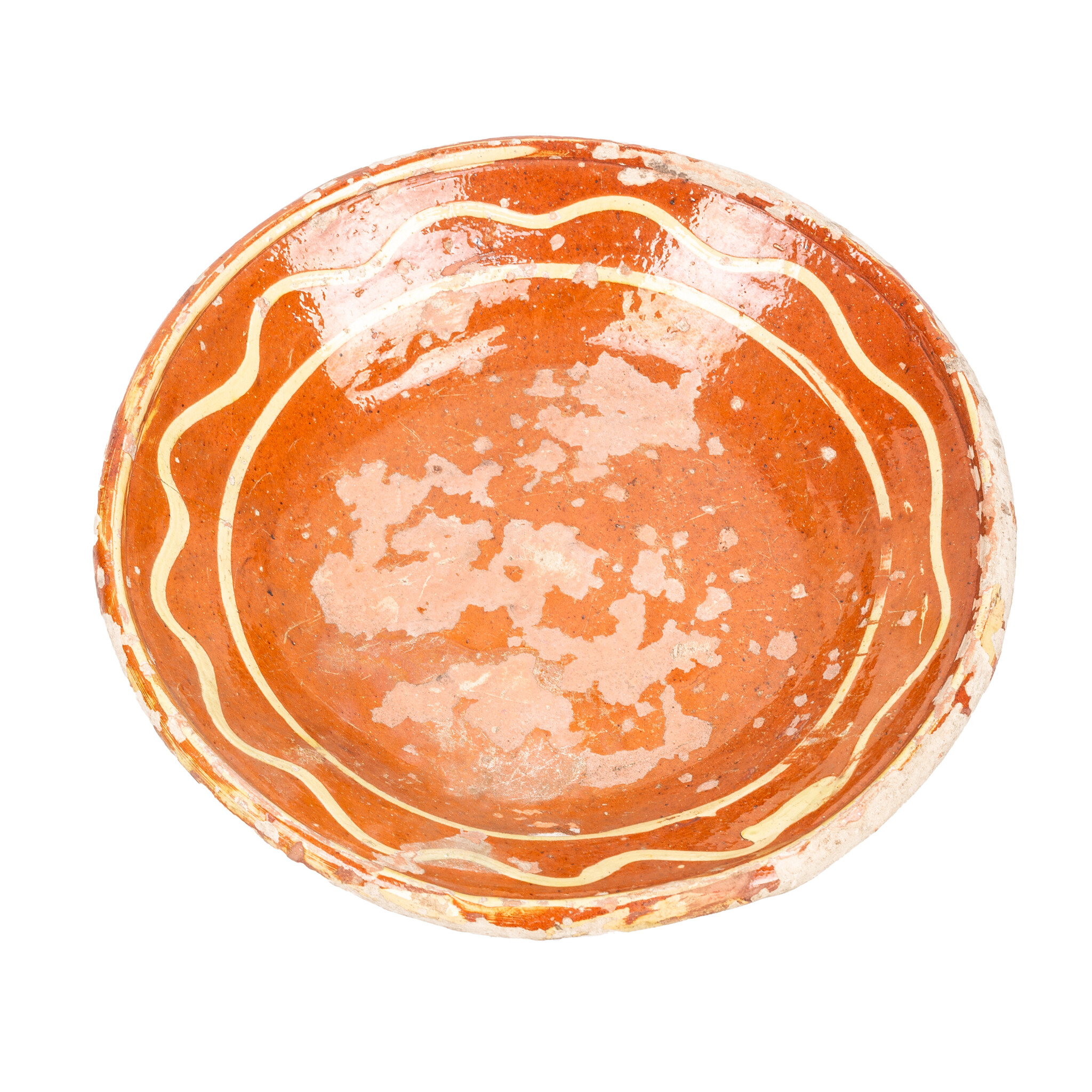 Schaal van slibaardewerk. De schaal van rood geglazuurd aardewerk is bewerkt met de ringeloortechniek, waarbij een versiering van wit slib is opgebracht op de nog ongebakken schaal. De slibversiering wordt voor het bakken op de schaal aangebracht als versiering. Dit gebeurde vroeger met een uitgeholde koehoorn, waarvan de punt was afgeslepen en in de opening een afgeschuinde rietstengel werd geschoven. Het gaat vermoedelijk om een bodemvondst. Datering: 17e-18e eeuw. Conditie: het aardewerk is beschadigd en delen van het glazuur zijn verdwenen. Afmetingen: ca. 6 x Ø 29 cm.
