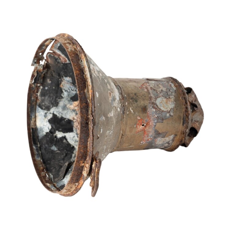 Een scheepslamp met kabelgeleiders. Datering: 20ste eeuw. Conditie: Aangetast, veel roestplekken, de bodem is ook doorgeroest. Afmetingen: ca. 66 cm hoog, diameter van 24,5 cm.