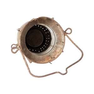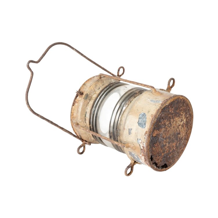 Een scheepslamp met kabelgeleiders. Datering: 20ste eeuw. Conditie: Aangetast, veel roestplekken, de bodem is ook doorgeroest. Afmetingen: ca. 66 cm hoog, diameter van 24,5 cm.