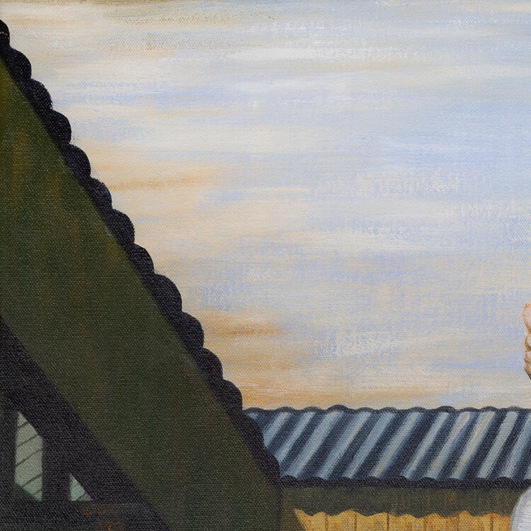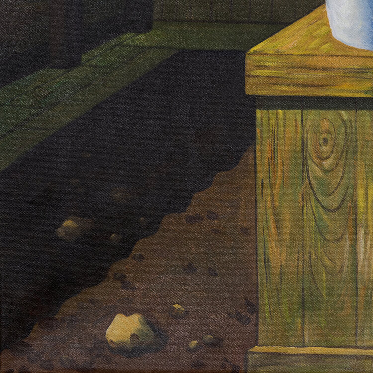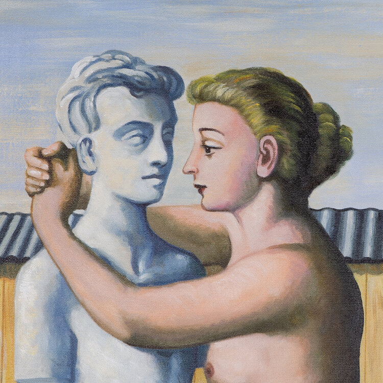 Schilderij van onbekende maker naar het bekende werk Pygmalion van Paul Delvaux. Verf op doek op spierraam. Afbeelding van een naakte vrouw die een standbeeld van een man omhelst. Daarnaast een naakte vrouw bedekt met bloemen en een man in pak met bolhoed. Geen signatuur. Datering: voor 2017. Conditie: goed. Afmetingen: 116 x 147 cm.