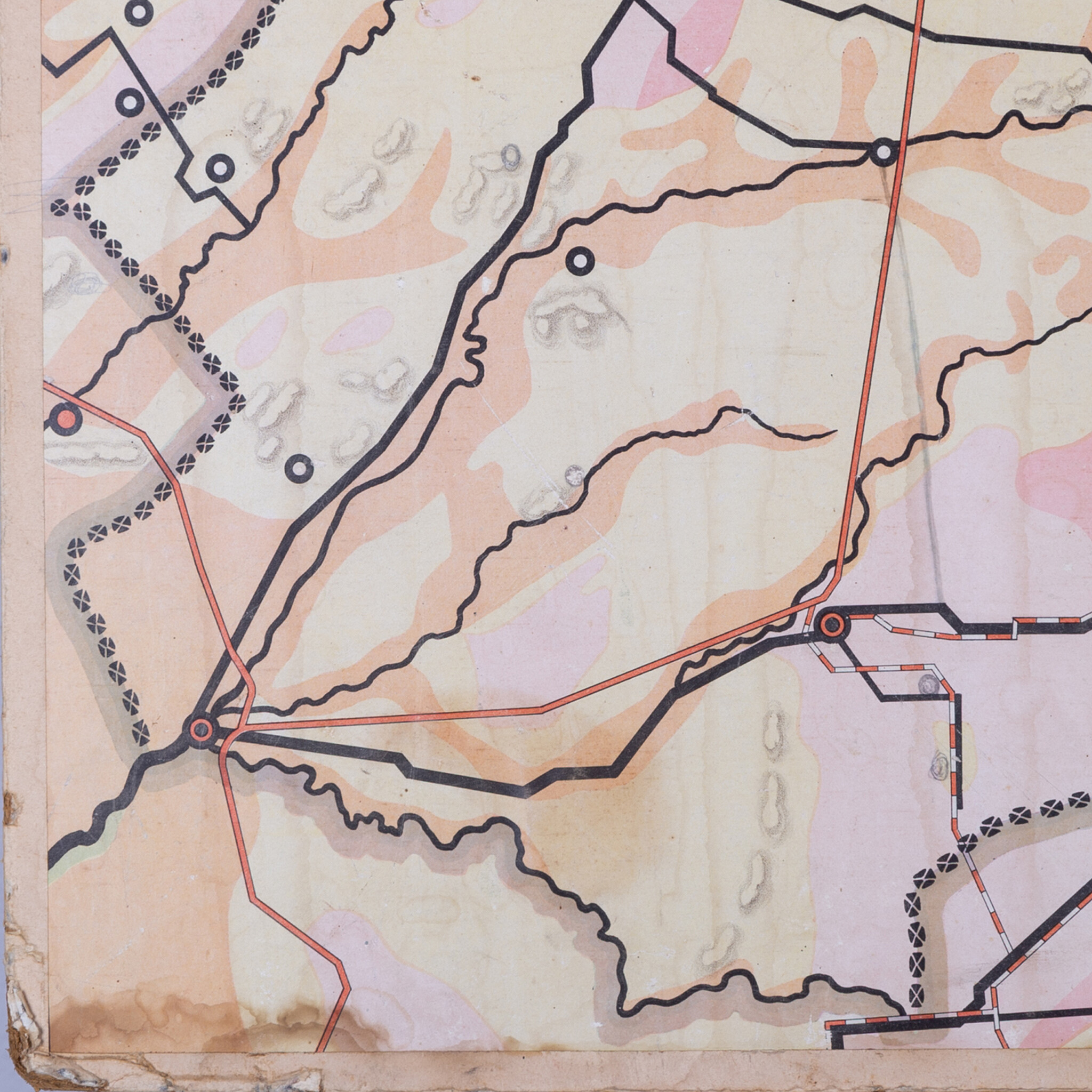 Schoolplaat 'Drente' door R. Bos, 1e druk. Uitgave van P. Noordhoff Groningen. Met potlood zijn door iemand notities en extra steden toegevoegd aan de kaart, een leuke toevoeging aan de historie van het stuk! Datering: 1906-1907. Conditie: gebruikssporen zoals verkleuring en schade aan de randen, ook een kras en schadeplekjes op het beeldvlak. Afmetingen: ca. 72 x 70 cm.
