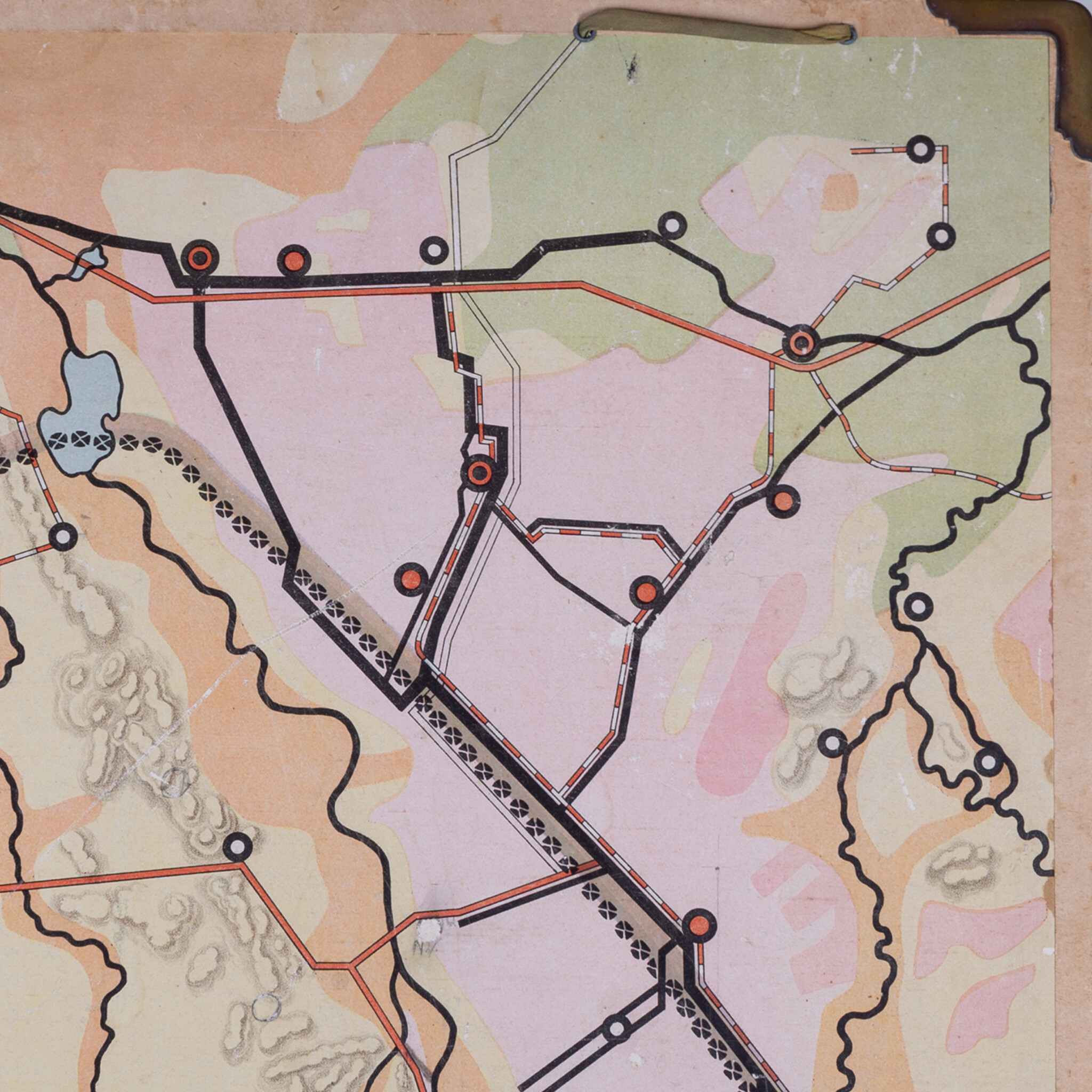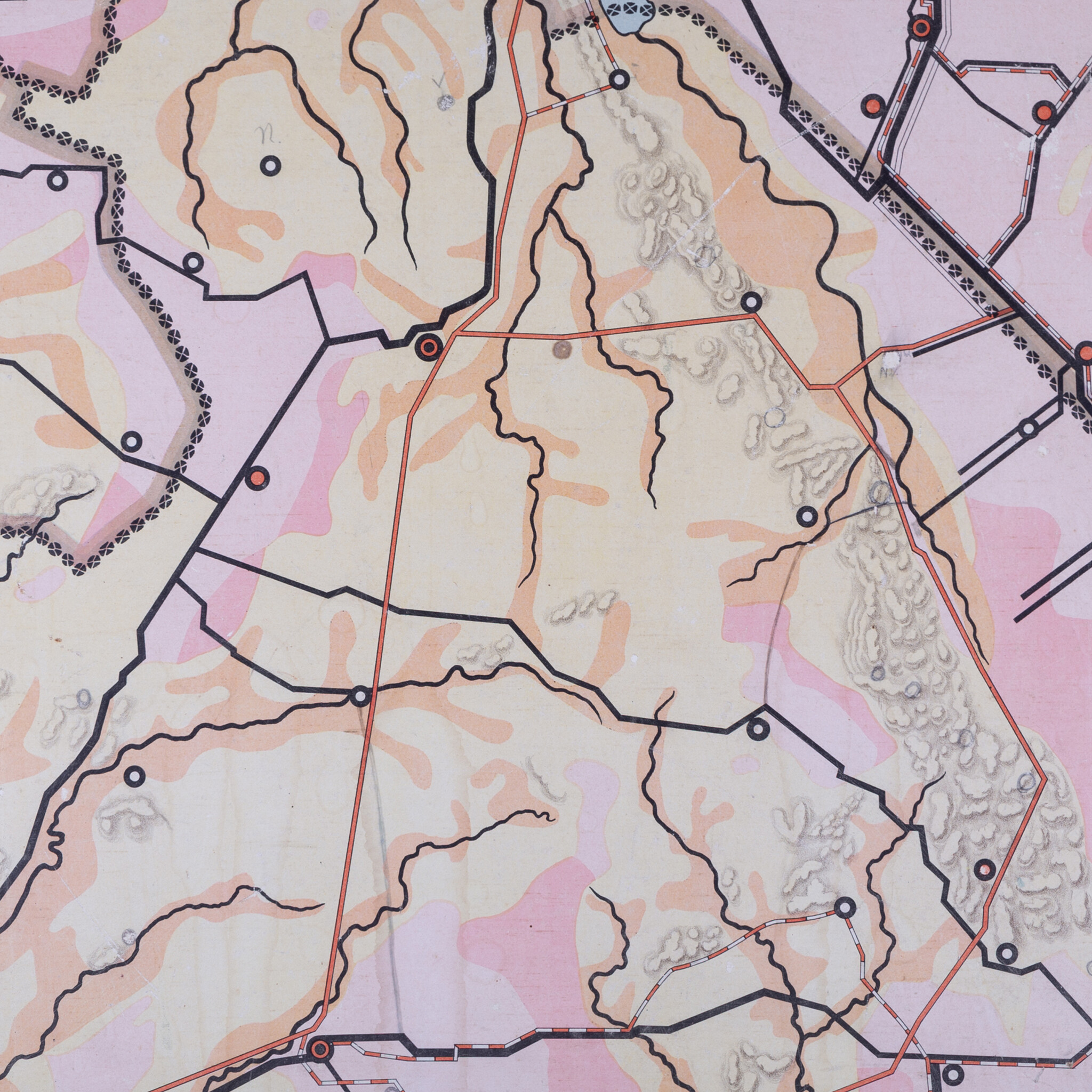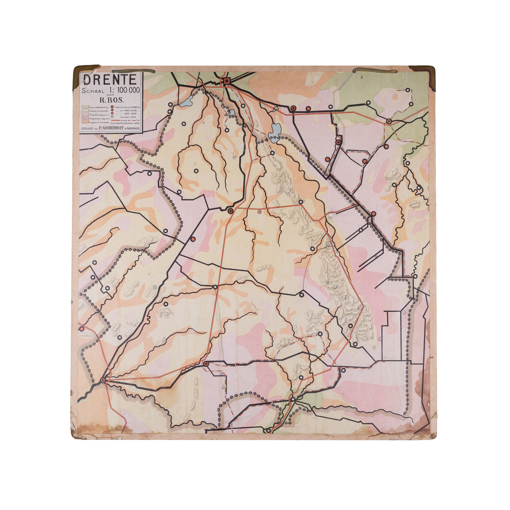 Schoolplaat 'Drente' door R. Bos, 1e druk. Uitgave van P. Noordhoff Groningen. Met potlood zijn door iemand notities en extra steden toegevoegd aan de kaart, een leuke toevoeging aan de historie van het stuk! Datering: 1906-1907.