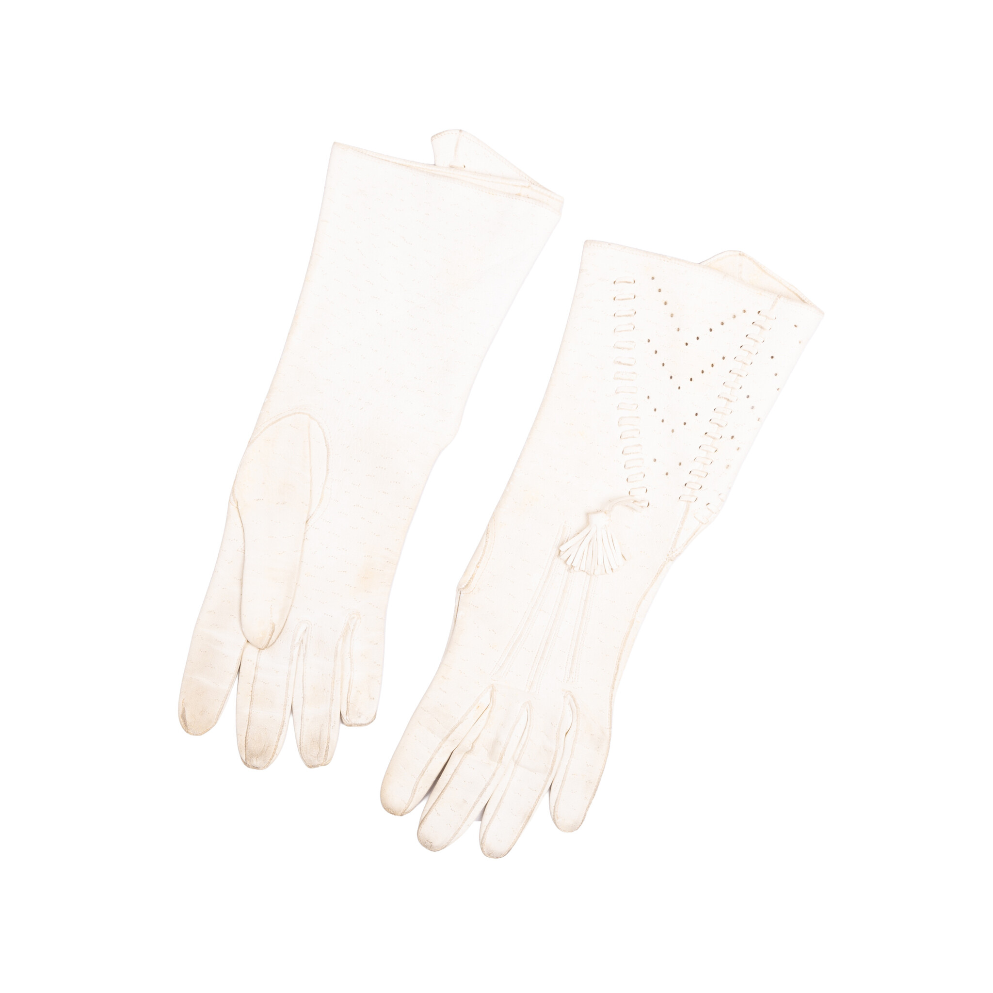 Schoudertas, portemonnee en handschoenen. Datering 20ste eeuw. De beige leren schoudertas van geperforeerd leer met bruine accenten heeft een hengsel, metalen elementen en een drukknoopsluiting. De binnenzijde is bekleed met een crèmekleurige binnenvoering; Het bruine leren portemonneetje met gevlochten randen, heeft een flap aan de voorkant; Een paar crèmekleurige leren handschoentjes (maat 6), versierd met stiksels, kleine perforaties en een kwastje. De manchetten van de handschoenen lopen wijd uit. Conditie: vertonen sporen van gebruik; naad hengsel laat hier en daar los, vlekken. Afmetingen tas: ca. 33 x 30 x 3 cm, hoogte met hengsel 74 cm. Afmetingen portemonneetje: ca. 10 x 8,5 x 0,5 cm. Afmetingen handschoentjes: ca. 29 x 8 cm.