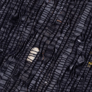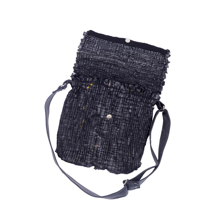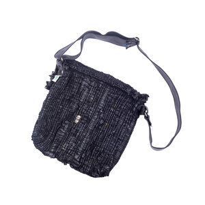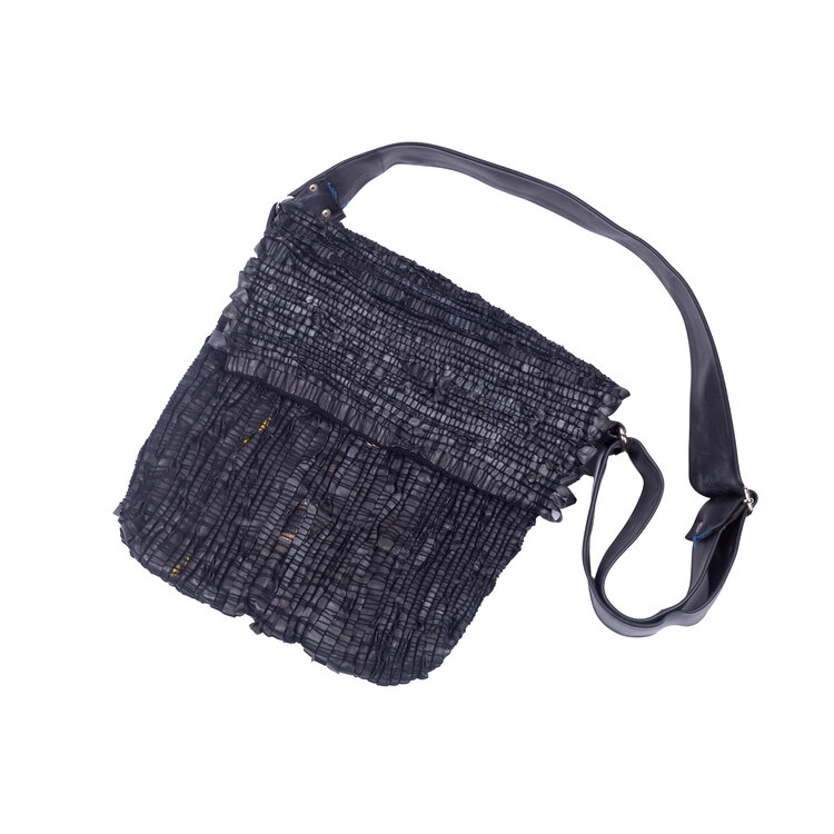 Schoudertas, gemaakt van fietsbanden van het merk 'De Kicker'. De fietsbanden zijn in stroken geknipt en geweven. De tas is gevoerd met groen-geel bedrukte stof, het heeft een magneetsluiting en een fietsband als schouderriem. Datering onbekend. 'De Kicker' is een atelier voor verstandelijk beperkte mensen. Conditie: vertoont gebruikssporen. Afmetingen: 32 x 33 x 4 cm.