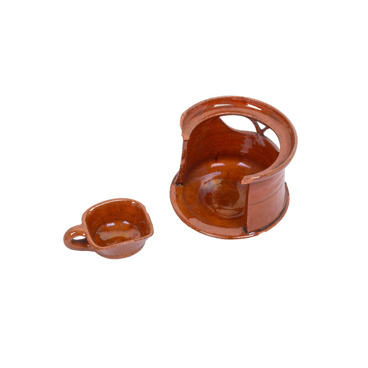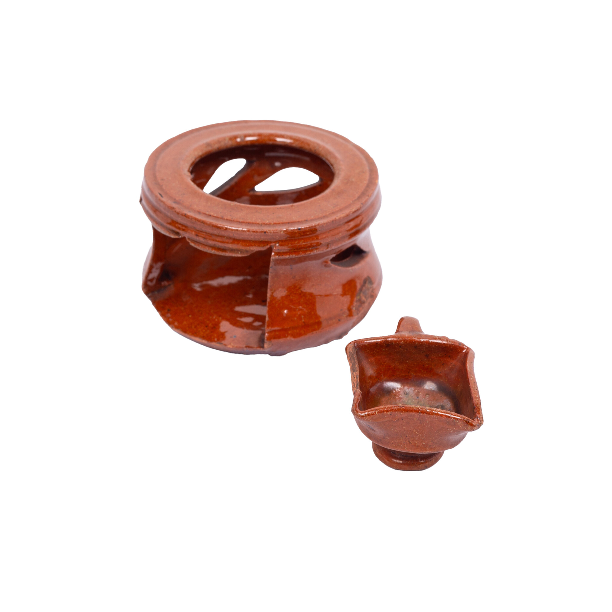 Set met 8 stuks miniatuur aardewerk, (rood)bruin geglazuurd: twee pannetjes, twee keer een komfoor met test, een kannetje met oor en schenklip, een kommetje en twee schaaltjes. Datering: onbekend. Conditie: delen van het miniatuur aardewerk ontbreken, zoals randen en oren. Afmetingen: variërend van ca. 2 x 3 x 3 cm tot 4,5 x 7 x 7 cm.