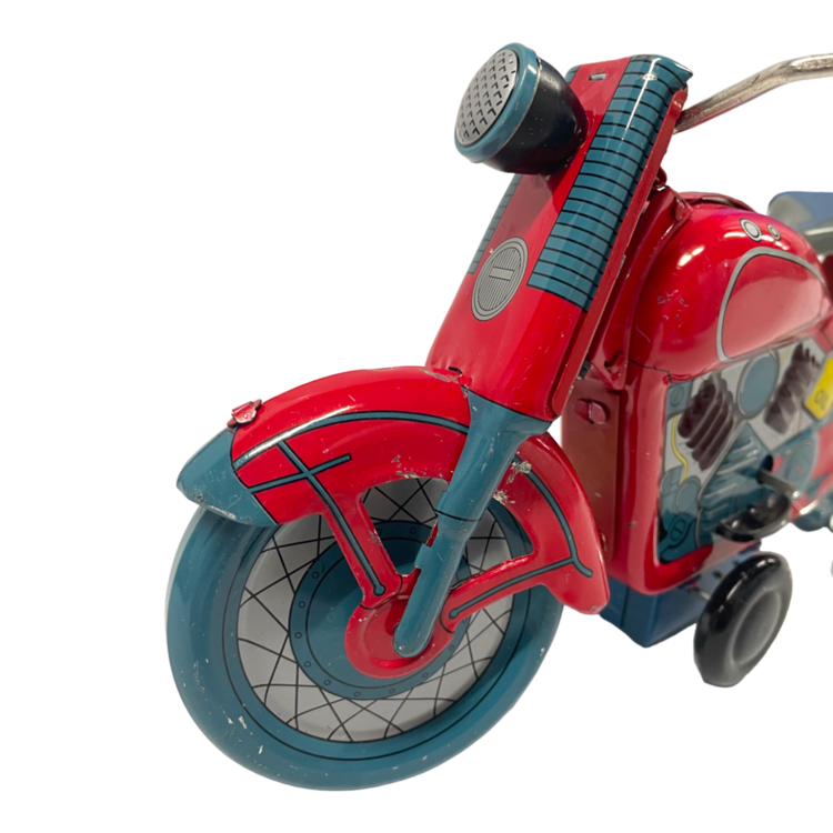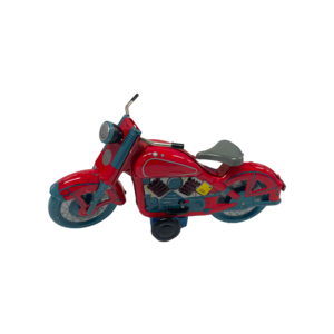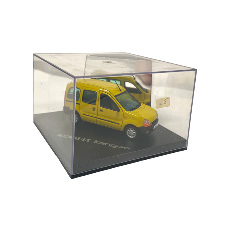 Set van drie motorvoertuigen bestaande uit een rode plastic auto, een gele Renault Kangoo en een tinnen opwind motor. De motor en Kangoo zitten nog in de originele verpakking. Datering: eind 20ste eeuw. Conditie: de Kangoo is als nieuw in de doos; enkel beschadiging aan de verpakking. De andere stukken tonen hier en daar gebruikssporen en de rode auto mist een koplamp. Afmetingen: 8 x 12 x 12 cm; 9,5 x 24 x 14 cm en 8,5 x 19,5 x 9 cm.