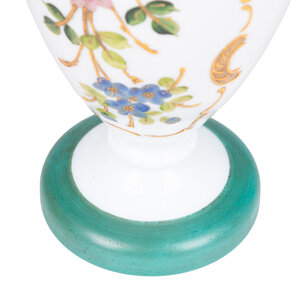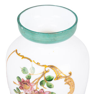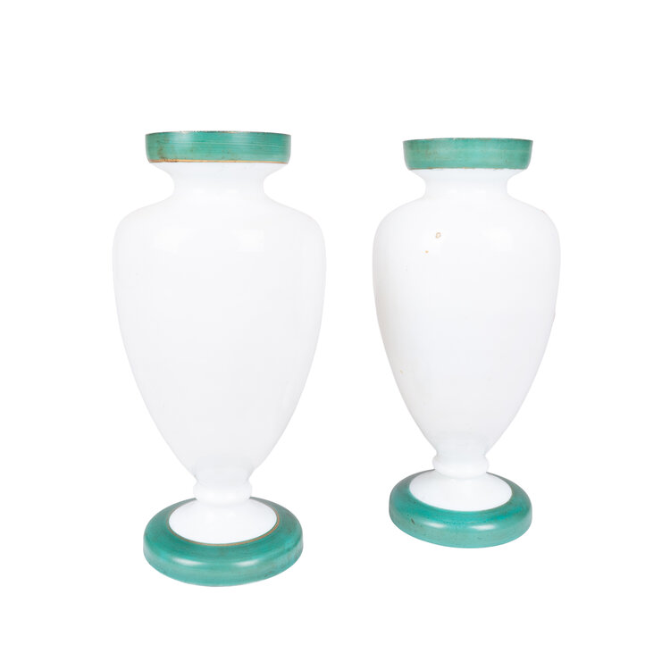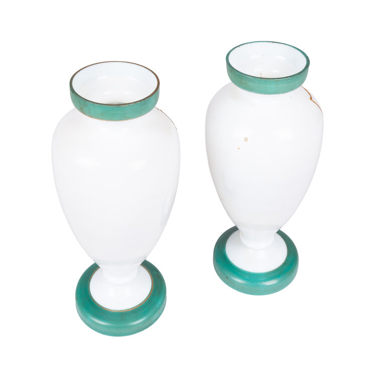 Een set van twee siervazen van opaalglas met bloemmotieven. De vazen hebben een witte basiskleur (melkglas) en versieringen in goud, roze en groen. Datering onbekend. Conditie: vertonen sporen van gebruik, de gouden lijnen zijn hier en daar vervaagd. Afmetingen: ca. 27 x Ø11 cm.