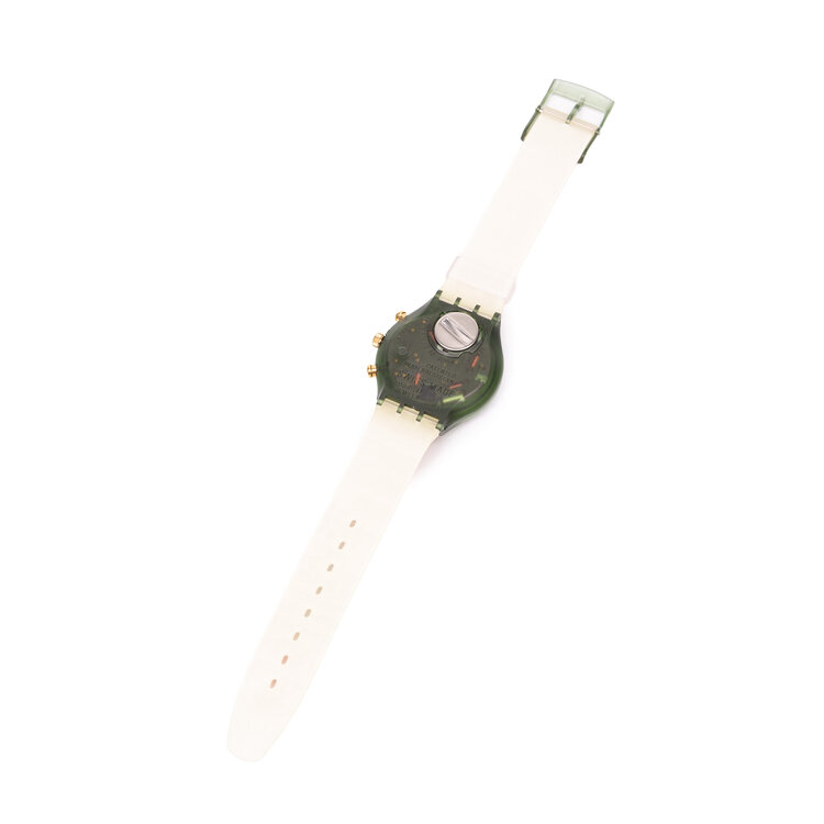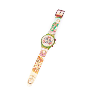 Set van drie Swatch watches, SCG 107 "Treasury", SCG 108 "Papiro", PMB 102 "Smooth velvet" met catalogus fall/winter 95-96. Treasury horloge versierd met koninklijke portretten. SCG 108 "Papiro" wit met zwart en rood met allerlei Aziatische kalligrafie en merken. Smooth velvet horloge met zwart fluwelen bandje en koordversiering. Conditie: Het horloge bevindt zich in originele verpakking en is ongedragen, het polsbandje kan verzwakt zijn door verstrijken van de tijd. Afmetingen: ca. 24,5 x 6 x 2 cm.