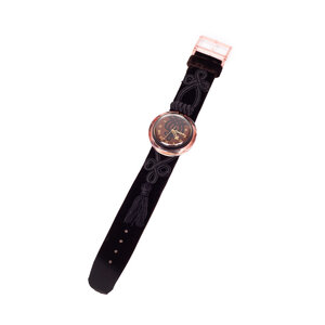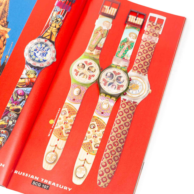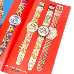 Set van drie Swatch watches, SCG 107 "Treasury", SCG 108 "Papiro", PMB 102 "Smooth velvet" met catalogus fall/winter 95-96. Treasury horloge versierd met koninklijke portretten. SCG 108 "Papiro" wit met zwart en rood met allerlei Aziatische kalligrafie en merken. Smooth velvet horloge met zwart fluwelen bandje en koordversiering. Conditie: Het horloge bevindt zich in originele verpakking en is ongedragen, het polsbandje kan verzwakt zijn door verstrijken van de tijd. Afmetingen: ca. 24,5 x 6 x 2 cm.