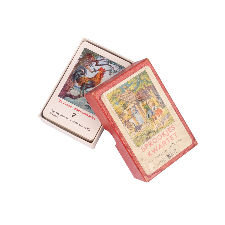 Setje met diverse papieren vintage curiosa. Sprookjeskwartet, naar sprookjes van Grimm, Jumbo spelen. Het spel bevat 9 kwartetten met afbeeldingen en teksten uit de sprookjes van Grimm in een doosje. Datering: midden 20ste eeuw. Conditie: het spel is compleet, vertoont gebruikssporen. Afmetingen doosje: ca. 12 x 8 x 4 cm.; Mapje met 10 ansichtkaarten met tekeningen en teksten met als onderwerp 'Manneke-Pis', Brussel. Datering: 20 ste eeuw. Conditie: scheurtje in hoesje. Afmetingen hoesje: ca. 14,5 x 9,5 cm; Vijf tweedimensionale kartonnen figuren die rechtop kunnen staan met dezelfde bedrukking op beide kanten. Het hoofd zit los en kan omhoog en omlaag. Datering: 20 ste eeuw. Conditie: lichte beschadigingen, vlekken en verkleuring. Afmetingen: ca. 22 x 6 cm.