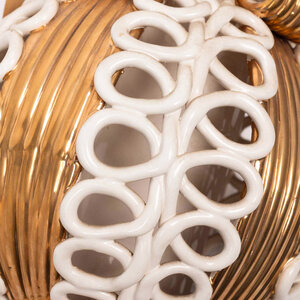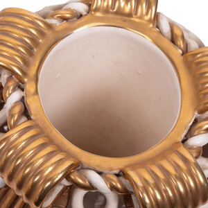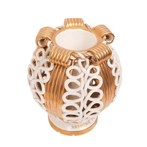 Keramieken siervaas 'Harmonie Tourangelle S.N.C.F. septembre 1951'; vervaardigd door l'Atelier de Ceramique de Sainte-Radegonde. De vaas is goud met wit versierd met sierlijke elementen. Aan de onderzijde gemerkt door het atelier. Het Atelier Sainte-Radegonde was vanaf het einde van de 19de eeuw een belangrijke producent van keramiek sculpturen en vazen. Het atelier is in 1972 gesloten. Datering: 1951. Conditie: aan de voet een paar chipjes en het is wat vuil, maar verder in mooie staat. Afmetingen: ca. 26 x ø 22 cm.
