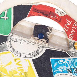 Sjaal en singles houder. Sjaal, jaren 1950. De sjaal heeft afbeeldingen van sterren uit de jaren 50, waaronder Elvis Presley, James Dean en Brigitte Bardot; Vinyl houder voor singles, jaren 1960. De houder heeft een zachte hoes met 20 vakken. Op de hoes s