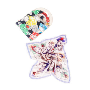 Sjaal en singles houder. Sjaal, vintage uit de jaren 1950. De sjaal heeft afbeeldingen van sterren uit de jaren 50, waaronder Elvis Presley, James Dean en Brigitte Bardot. Conditie: vertoont gebruikssporen, de stof is gekreukt en niet gereinigd. Afmetingen ca.: 47 x 47 cm; Vinyl houder voor singles, vintage uit de jaren 1960. De houder heeft een zachte hoes met 20 vakken. Op de hoes staan kleurrijke afbeeldingen van singlehoesjes en muziekinstrumenten. Conditie: slijtage aan de randen en hoeken, en verkleuring. Afmetingen ca.: 27 x 20,5 x 5 cm.