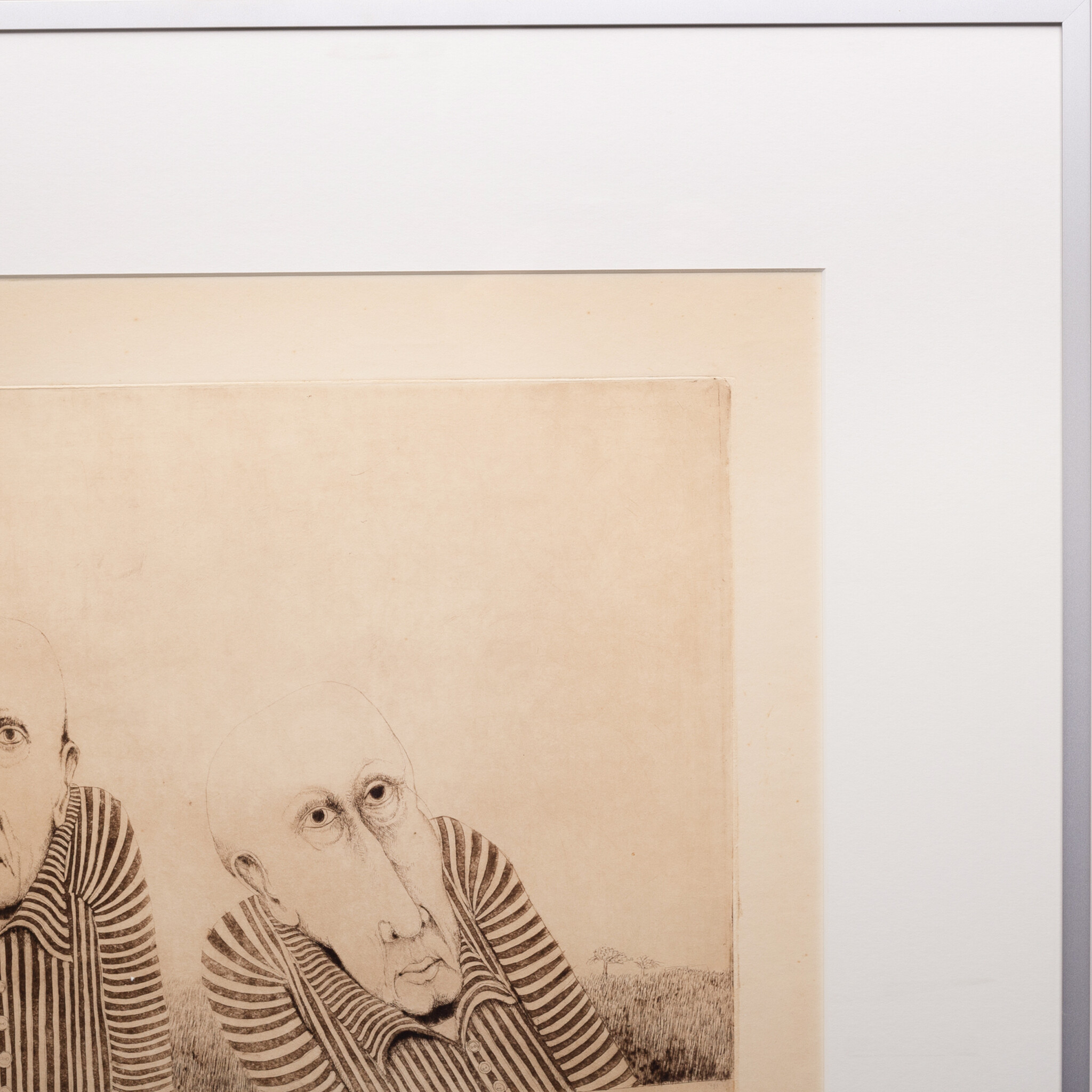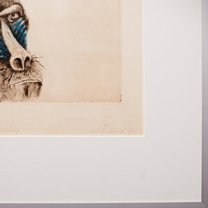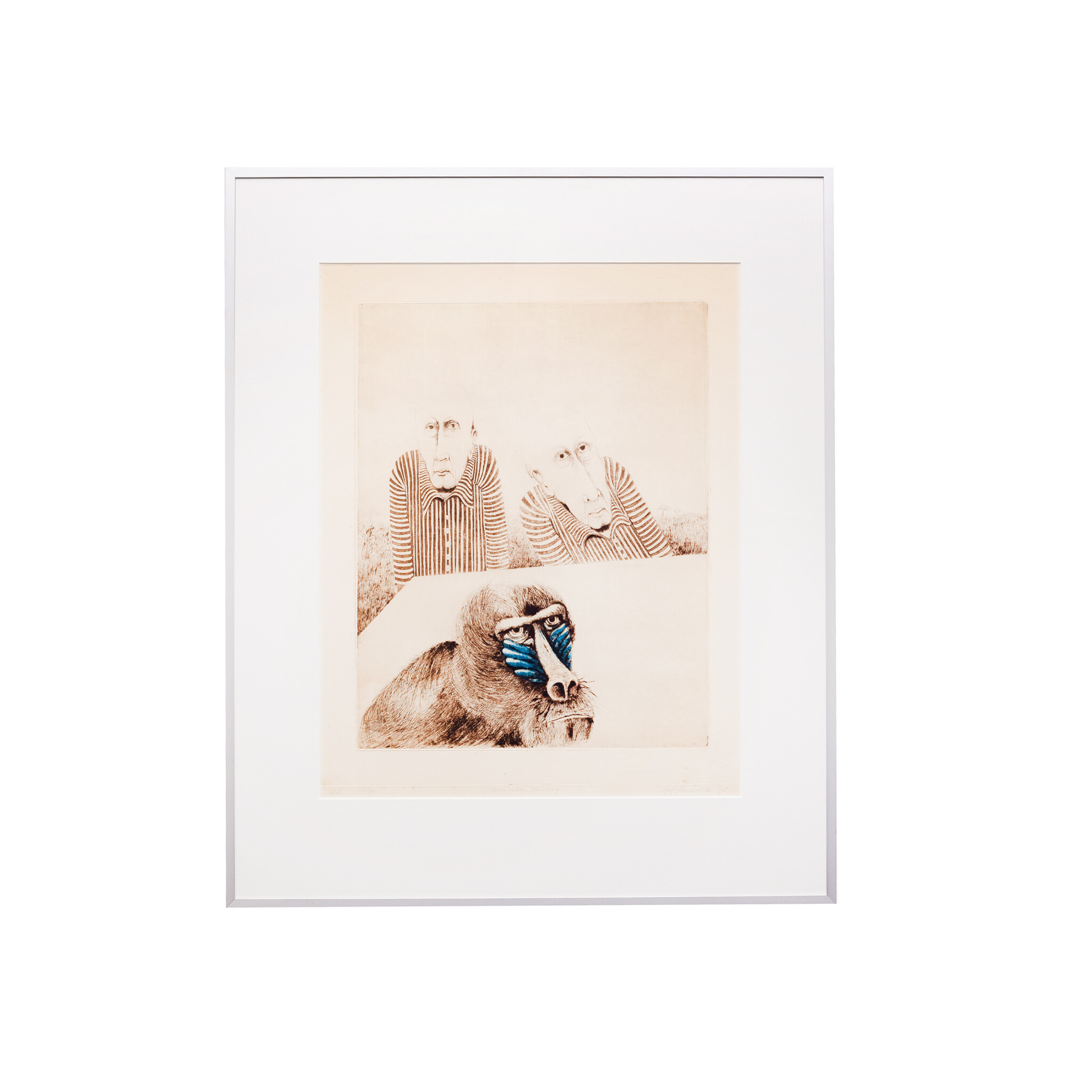 Sjef Henderickx (Schiedam, 1944), 'Mooi Weer Vandaag'. Ets oplage 48/70, in metalen lijst met passe-partout. Afbeelding van twee kale mannen met streepje shirts en een baviaan in zwart-wit. Alleen de baviaan heeft een blauw accent op de wangen. Signatuur rechtsonder. Datering: 1973. Conditie: papier vertoont verkleuring en vlekken, gebruikssporen lijst. Afmetingen lijst: 78,5 x 65,5 cm; beeldvlak: 47 x 37 cm.