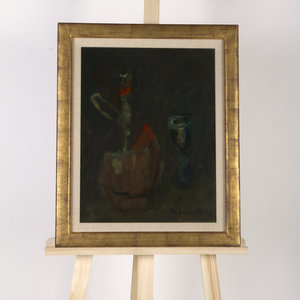Theo Swagemakers, Stilleven Chiantifles met glas, 1930. Olieverf op doek, werk 45.5 x 35 cm, lijst 55.7 x 45.6 cm. Stilleven in donkergroene kleuren met tinten lichtgroen en rood die eruit springen. Gesigneerd rechtsonder. Het werk is ingelijst in een houten lijst. Theo Swagemakers (1898-1994) is een bekende Nederlandse schilder van voornamelijk portretten en stillevens. Hij genoot zijn opleiding in Brussel en Parijs en heeft verschillende beroemdheden mogen portretteren, zoals een groot deel van de Koninklijke familie. Hiervoor heeft hij de Thérèse van Duyl-Schwartzeprijs in ontvangst mogen nemen in 1958. Conditie: het werk is in redelijke conditie. Sporen van craquelé zichtbaar en hier en daar kleine krasjes. De lijst heeft enkele gebruikssporen.