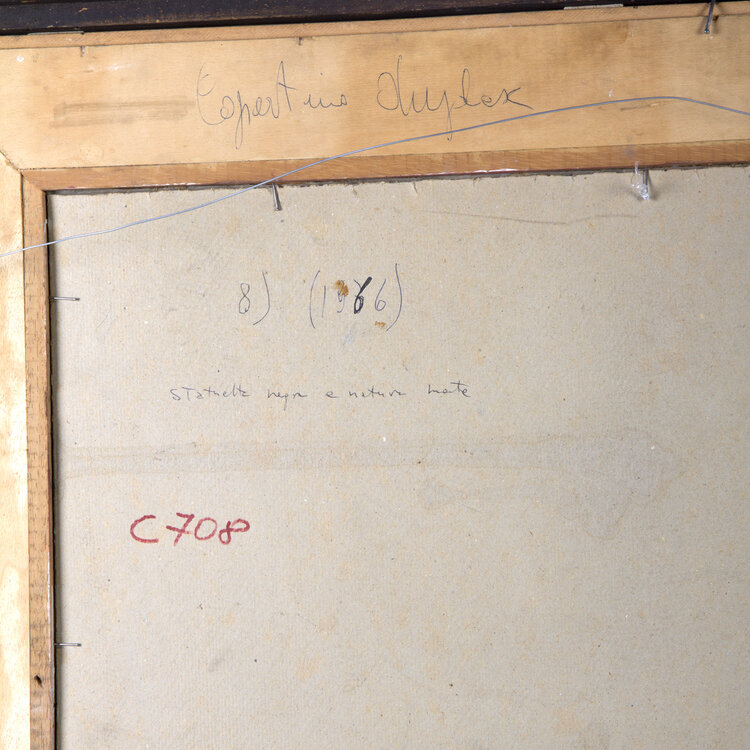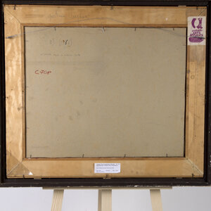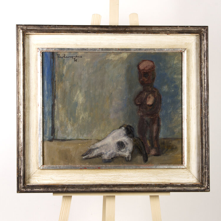 Theo Swagemakers, Stilleven houten beeld met schedel, 1966. Olieverf op board, 49 x 60.8 cm. De compositie bestaat uit een donkerrood beeldje van een vrouw naast een schedel van een dier, mogelijk een geit. Gesigneerd linksboven. Het werk is ingelijst in een houten lijst. Theo Swagemakers (1898-1994) is een bekende Nederlandse schilder van voornamelijk portretten en stillevens. Hij genoot zijn opleiding in Brussel en Parijs en heeft verschillende beroemdheden mogen portretteren, zoals een groot deel van de Koninklijke familie. Hiervoor heeft hij de Thérèse van Duyl-Schwartzeprijs in ontvangst mogen nemen in 1958. Conditie: het werk is in redelijke conditie. Craquelé is zichtbaar in de verf en het board is wat gebobbeld. De lijst heeft gebruikssporen zoals krasjes en putjes.