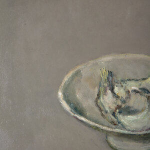 Theo Swagemakers, Stilleven in grijs, 1969. Olieverf op board, werk 50.5 x 61 cm, lijst 67.5 x 77.5 cm. Stilleven van een schaal met een onbekend object in grijstinten en crème. Gesigneerd onderaan. Het werk is ingelijst in een houten lijst. Theo Swagemakers (1898-1994) is een bekende Nederlandse schilder van voornamelijk portretten en stillevens. Hij genoot zijn opleiding in Brussel en Parijs en heeft verschillende beroemdheden mogen portretteren, zoals een groot deel van de Koninklijke familie. Hiervoor heeft hij de Thérèse van Duyl-Schwartzeprijs in ontvangst mogen nemen in 1958. Conditie: het werk is in prima conditie. Op sommige plekken zijn kleine puntjes verf versleten. De lijst heeft gebruikssporen.