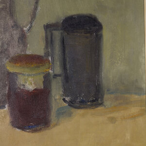 Theo Swagemakers, Stilleven met aardewerk, 1965. Olieverf op doek op board, werk 51 x 61 cm, lijst 63.3 x 73.5 cm. Stilleven in warme kleuren van twee kannen en twee potten of mokken. Gesigneerd rechtsonder. Het werk is ingelijst in een houten lijst. Theo Swagemakers (1898-1994) is een bekende Nederlandse schilder van voornamelijk portretten en stillevens. Hij genoot zijn opleiding in Brussel en Parijs en heeft verschillende beroemdheden mogen portretteren, zoals een groot deel van de Koninklijke familie. Hiervoor heeft hij de Thérèse van Duyl-Schwartzeprijs in ontvangst mogen nemen in 1958. Conditie: het werk is in prima conditie. Het doek is niet strak in de lijst geplaatst. Lijst heeft gebruikssporen.