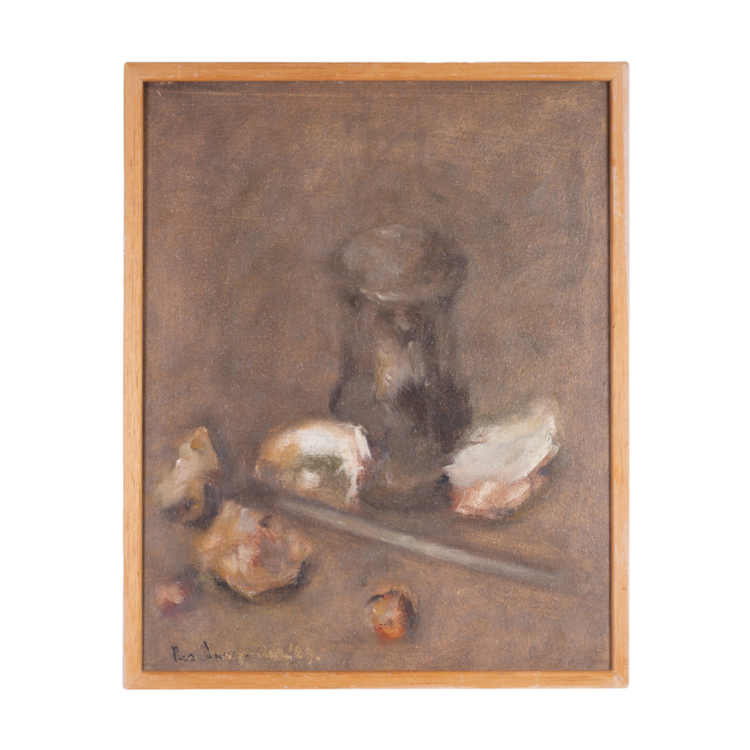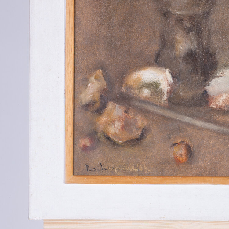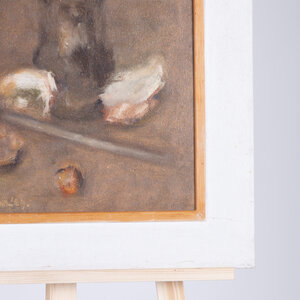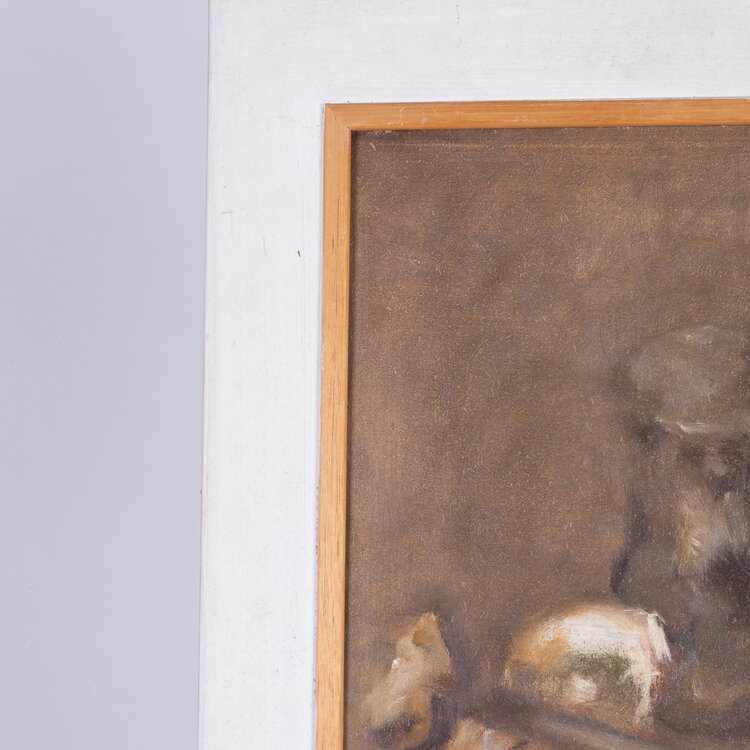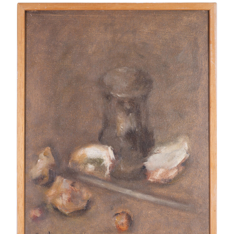 Theo Swagemakers, Stilleven tinnen kan met oesters, ca. 1960-90. Olieverf op paneel, werk 49.5 x 39.5 cm, lijst 66 x 56 cm. Mooi stilleven in aardetinten met grove toets geschilderd. Gesigneerd linksonder. Het werk is ingelijst in een houten lijst. Theo Swagemakers (1898-1994) is een bekende Nederlandse schilder van voornamelijk portretten en stillevens. Hij genoot zijn opleiding in Brussel en Parijs en heeft verschillende beroemdheden mogen portretteren, zoals een groot deel van de Koninklijke familie. Hiervoor heeft hij de Thérèse van Duyl-Schwartzeprijs in ontvangst mogen nemen in 1958. Conditie: het werk is in prima conditie. De verf van de signatuur is deels versleten. De lijst vertoont gebruikssporen en tekenen van ouderdom.