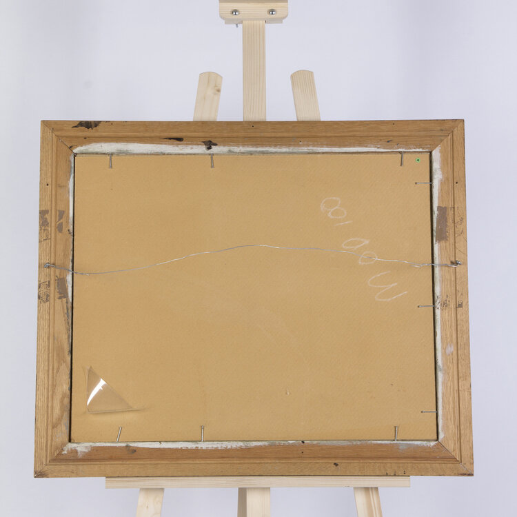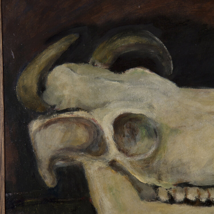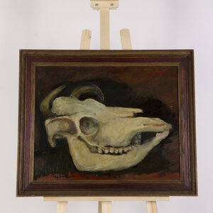 Theo Swagemakers, Stilleven van ossenkop, 1965. Olieverf op board, werk 48.5 x 60.5 cm, lijst 59.8 x 71.6 cm. Stilleven met de schedel van een os tegen een zwart-rode achtergrond. Gesigneerd linksonder. Het werk is ingelijst in een houten lijst. Theo Swagemakers (1898-1994) is een bekende Nederlandse schilder van voornamelijk portretten en stillevens. Hij genoot zijn opleiding in Brussel en Parijs en heeft verschillende beroemdheden mogen portretteren, zoals een groot deel van de Koninklijke familie. Hiervoor heeft hij de Thérèse van Duyl-Schwartzeprijs in ontvangst mogen nemen in 1958. Conditie: het werk is in prima conditie. Hier en daar is een putje in de verf te zien. Lijst heeft gebruikssporen.