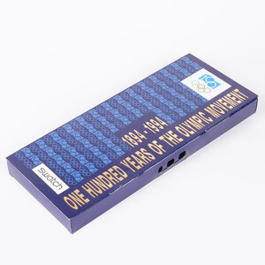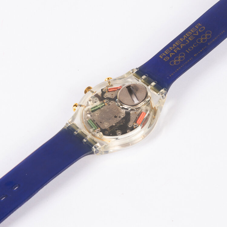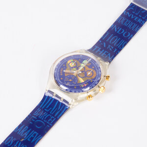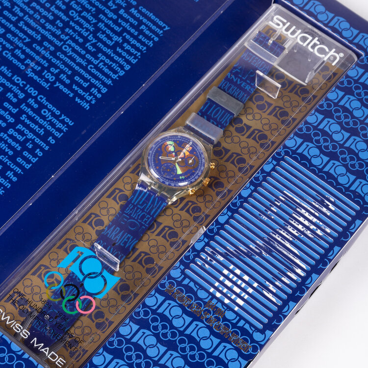 Swatch '1894-1994 One Hundred Years of the Olympic Movement' (SCZ1011), 1994. C-H-R-O-N-O horloge met donkerblauwe, met lichtblauw bedrukte armband en een wijzerplaat met de olymische ringen in blauw en zilverkleur. Deze editie is bewaard in de originele verpakking. Swatch werd in 1983 opgericht en onderscheidt zich als Zwitsers horlogemerk met zijn slimme techniek en bijzondere ontwerpen, die in beperkte oplage werden uitgevoerd. Vanwege de grote hoeveelheid verschillende designs en samenwerkingen werden de Swatch horloges collectors items die nog steeds wereldwijd worden verzameld. Conditie: Het horloge is in zeer goede ongebruikte conditie. Afmetingen ca. 23,0 x 4,3 x 0,8 cm