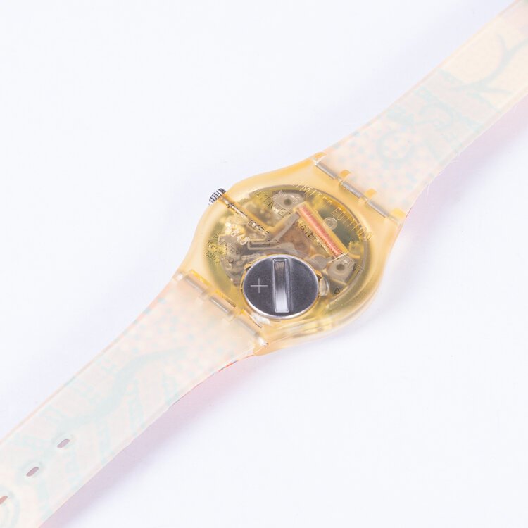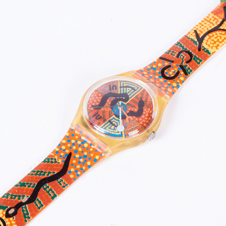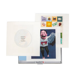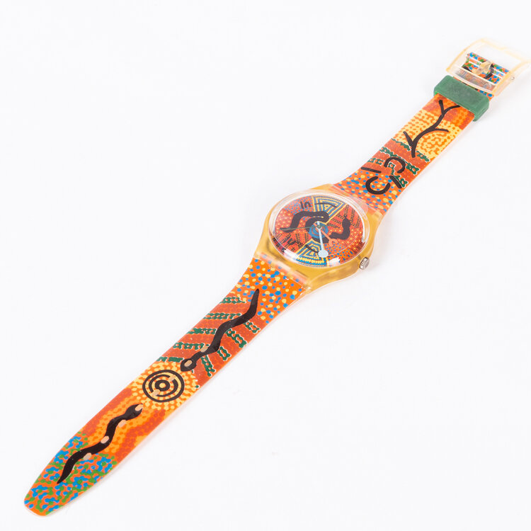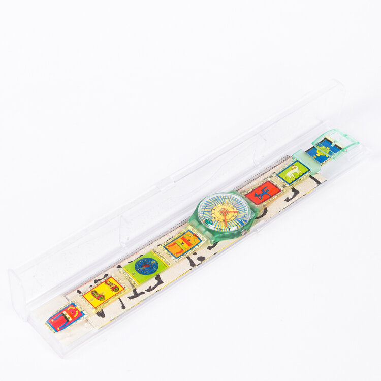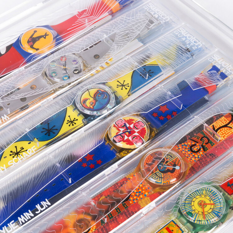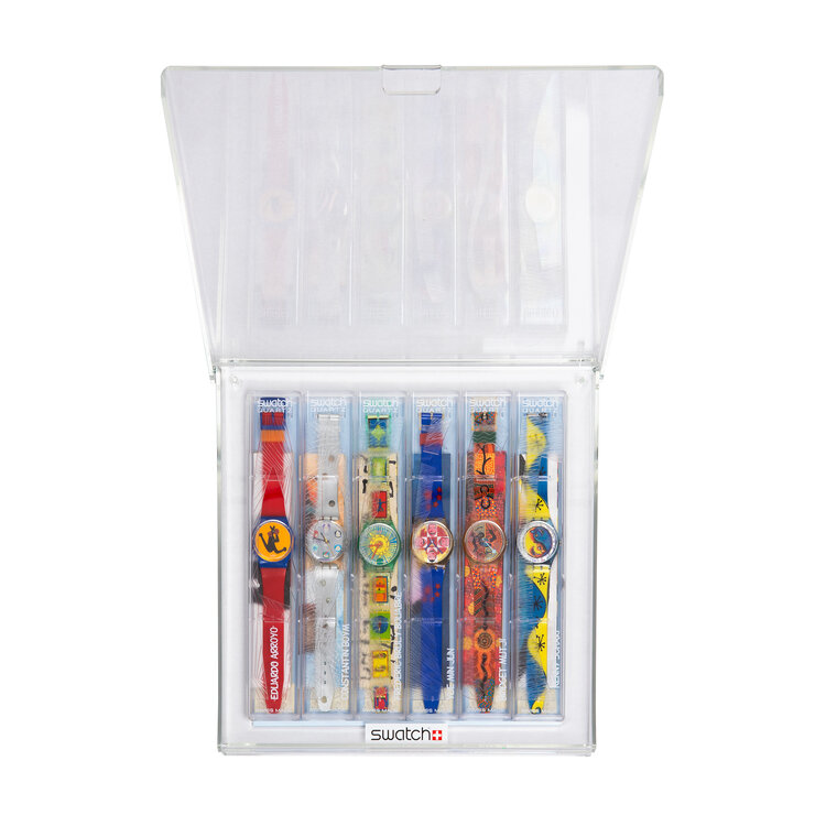Swatch 'Artists' 1995. Kunstof, metaal, papier. Ca. 30 x 29 x 2,5 cm. Luxe plexiglas box met zes door kunstenaars ontworpen horloges. De box bevat ook prints van de originele kunstwerken waarop de horloges gebaseerd zijn. De box bevat de horloges Eduardo Arroyo (Boxing GN 163), Constatin Boym (Lens Heaven GK 214) , Kenny Scharf (Fiz 'n Zip GN 164), Yue Min Jun (Wild Laugh GJ 117), Bridget Mutiji (Wanayarra Tjukurrpa GJ 116), Frederic Bruly Bouarbre (Cheik Nadro GG 140). Swatch werkt al vanaf 1985 samen met kunstenaar om een 'artist collectie' te produceren. Conditie: De horloges en de plexiglas display bevinden zich in originele verpakking en zijn in ongebruikte conditie.