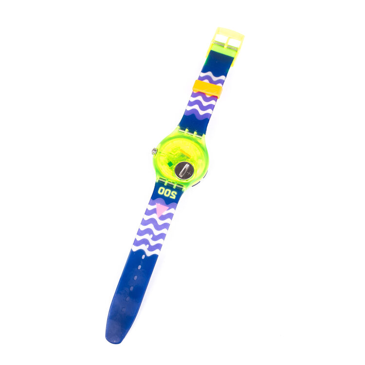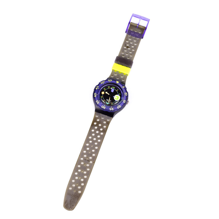 Swatch 'Captain Nemo', 1992; Swatch 'Coming Tide', 1992. Swatch Scuba 200 'Captain Nemo' SDB 101 uit 1992, met grijsgroen geperforeerde kunststof polsband; Swatch Scuba 200 'Coming Tide' SDJ 100 uit 1992, met transparant kunststof polsband met blauwe golven. Beide horloges hebben een draaibare lunette, zijn waterbestendig en hebben een precisie quartz uurwerk met batterij. Conditie: De horloges bevinden zich in originele verpakking en zijn ongedragen, polsbandjes kunnen verzwakt zijn door verstrijken van de tijd. Afmetingen verpakking: ca. 24,5 x 6 x 2 cm.