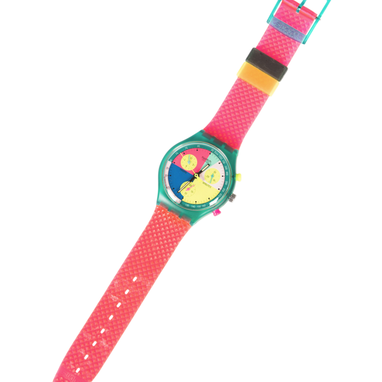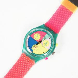 Swatch, 'Flash Arrow' 1991. Kunststof, 24,5 x 6 x 2 cm. Kleurrijk Swatch C-H-R-O-N-O horloge 'Flash Arrow' (SCL 100) met neonkleurige details met roze kunststof polsbandje met ruit structuur. Swatch werd in 1983 opgericht en onderscheidt zich als Zwitsers horlogemerk met zijn slimme techniek en bijzondere ontwerpen, die in beperkte oplage werden uitgevoerd. Vanwege de grote hoeveelheid verschillende designs en samenwerkingen werden de Swatch horloges collectors items die nog steeds wereldwijd worden verzameld. Conditie: Het horloge is in zeer goede ongebruikte conditie.