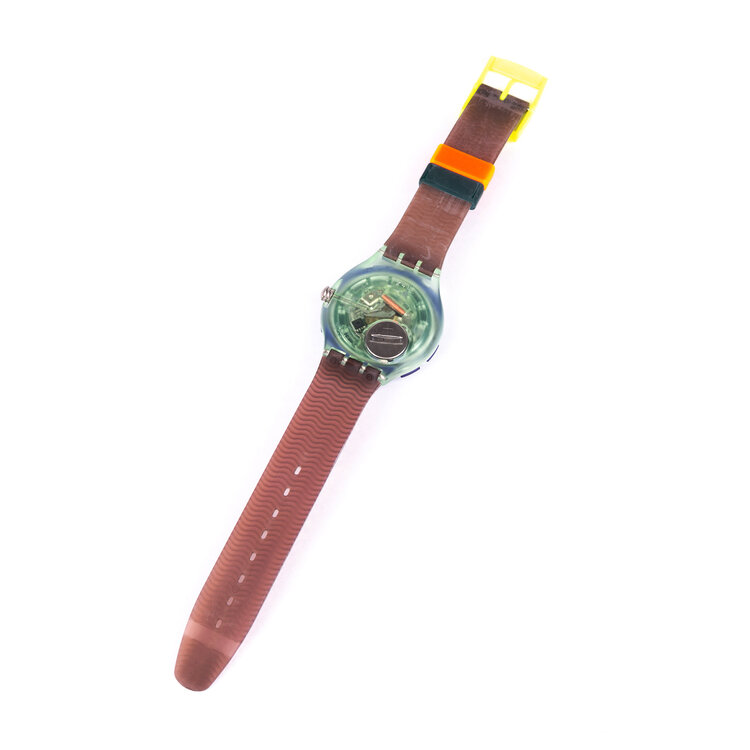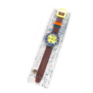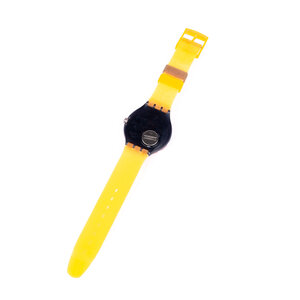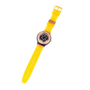 Swatch 'Spray Up', 1992; Swatch 'Morgan', 1994. Swatch Scuba 200 'Spray Up' SDN 103 uit 1992, met aubergine kunststof polsband; Swatch Scuba 200 'Morgan' SDM 102 uit 1994, met geel kunststof polsband. Beide horloges hebben een draaibare lunette, zijn waterbestendig en hebben een precisie quartz uurwerk met batterij. Conditie: De horloges bevinden zich in originele verpakking en zijn ongedragen, polsbandjes kunnen verzwakt zijn door verstrijken van de tijd. Afmetingen verpakking: ca. 24,5 x 6 x 2 cm.