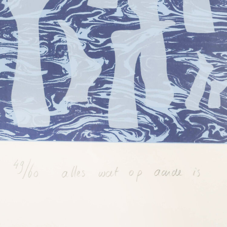 Tanneke Barendregt, Alles wat op aarde is, 1995. Zeefdruk op papier in metalen lijst, oplage 49/60. Abstracte compositie in blauw met voeten uitstekend naar boven. Linksonder oplagenummer en titel, rechtsonder signatuur en jaar. Conditie: goed, gebruikssporen aan lijst. Afmeting werk zonder lijst: 31 x 29 cm; incl. lijst: cm. 64 x 48,5 cm.