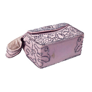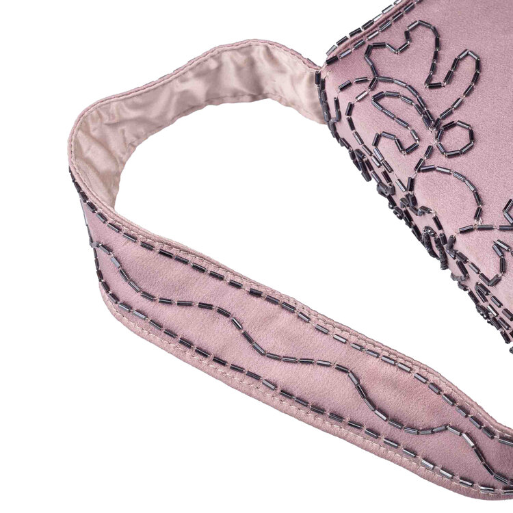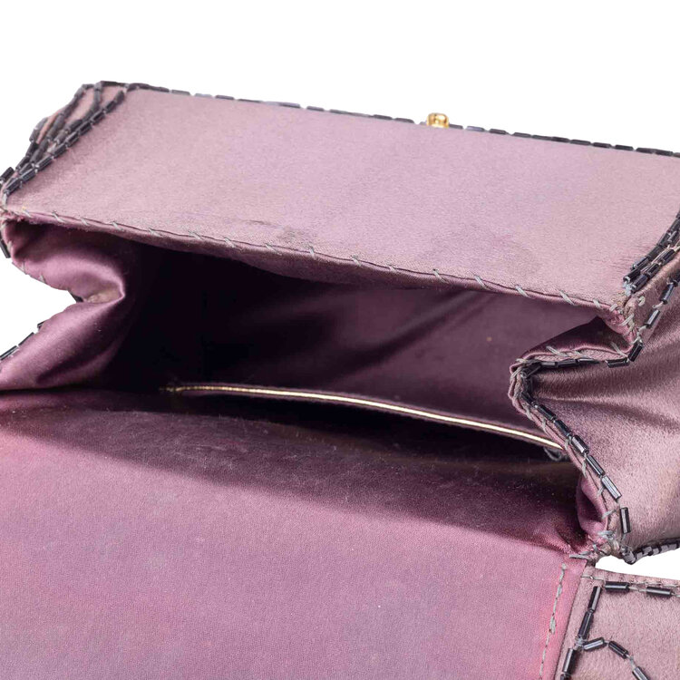 Kralentas van taupe zijde versierd met sierlijk bloemmotief. In het tasje zit een opbergvakje met spiegel en twee haarschuifjes. Datering: jaren '50. Conditie: redelijk goed, hier en daar missen enkele kraaltjes en de stof heeft op sommige plekken wat verkleuring en vlekken. Afmetingen ca.: 15 x 17 x 8 cm, hoogte incl. hengsel is 30 cm.