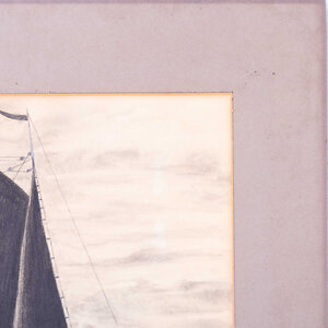 Tekening van een zeilboot door onbekende kunstenaar. Conté met potlood op papier in grijs passe-partout zonder lijst. Afbeelding van een zeilboot op zee in zwart-wit. Linksonder (onleesbaar) signatuur. Datering onbekend. Conditie: het werk en passe-partout zijn wat verkleurd en een aan de achterzijde zijn wat beschadigingen in het papier te zien. Afmetingen passe-partout: 54 x 46 cm.