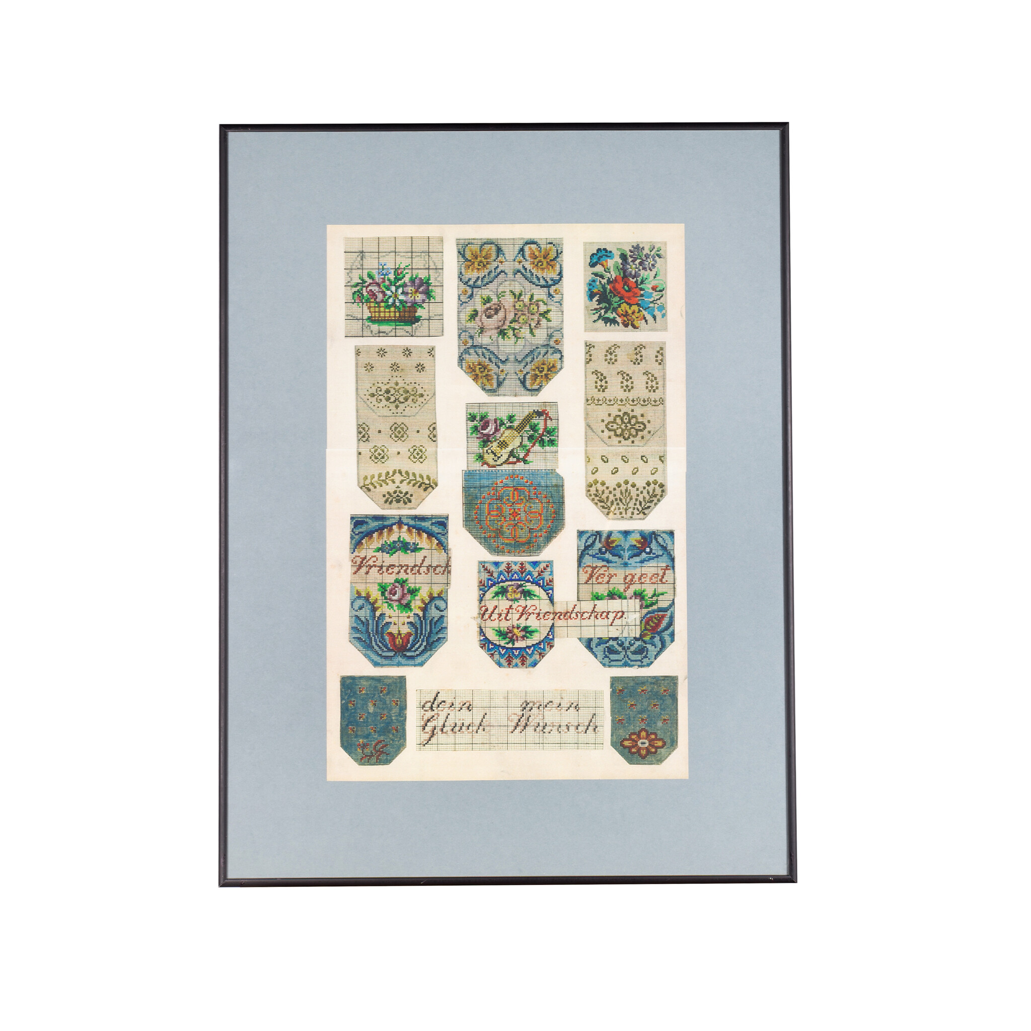 Vel met kopieën van originele patronen voor kralentassen uit de 19de eeuw, in zwart metalen lijst. Afgebeeld zijn kleurrijke bloempatronen met verschillende teksten, zoals: "Uit Vriendschap" en "dein Glück, mein Wunsch". In de 19e en begin 20e eeuw waren kralentassen en -buidels erg in de mode. Hoewel het bepaald niet gemakkelijk was, werd met name het breien van tassen populair. De patronen werden gebruikt om de duizenden kralen in juiste volgorde op het garen te rijgen, voordat vervolgens de tas gebreid kon worden. Door de bewerkelijke en tijdrovende techniek behoorden deze kralentassen tot de luxueuze producten. In Nederland vonden de gebreide kralentassen uit Duitsland zoveel aftrek in de klederdrachten dat de Nederlandse vrouw de kralentassen ook zelf ging breien om aan de zilveren beugel te zetten. Conditie: het vel bestaat uit twee delen en is aan de achterzijde met plakband aan elkaar bevestigd, vlekken op het vel; gebruikssporen lijst. Afmetingen lijst: 65,5 x 50,5 cm. Afmetingen vel: 47,5 x 31,5 cm.