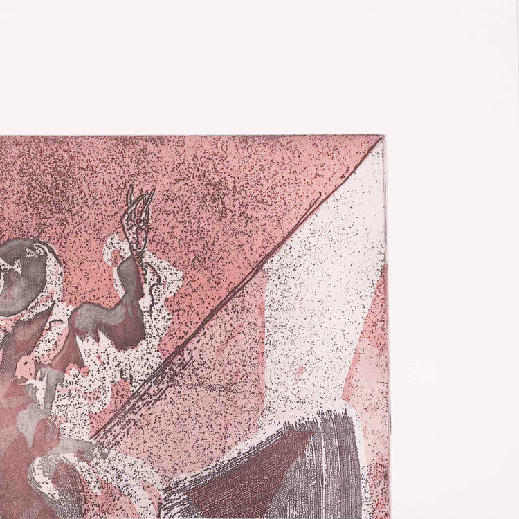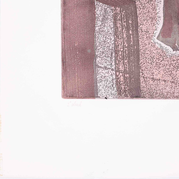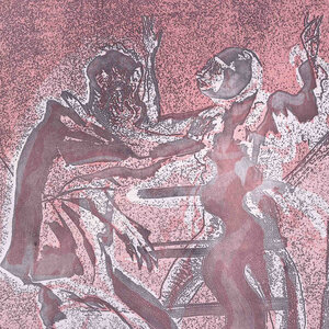Th. Koolhaas, De val van het huis Usher, 1980. Kleurenets op papier zonder lijst, 1e druk. Afbeelding van twee ruziënde mensen in de kleuren zwart en rood. Signatuur rechtsonder. Conditie: het papier toont hier en daar gebruikssporen. Afmeting papier: 49 x 63 cm.