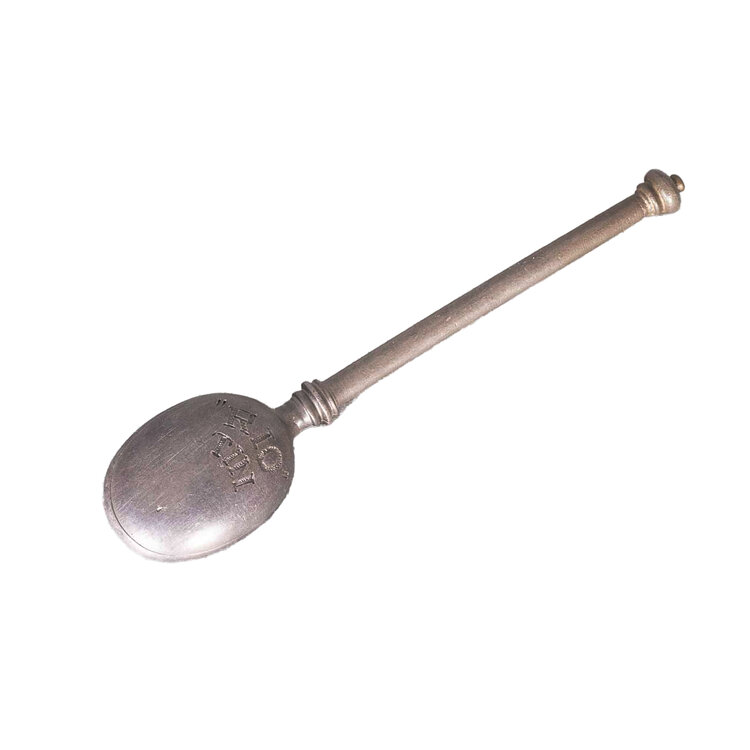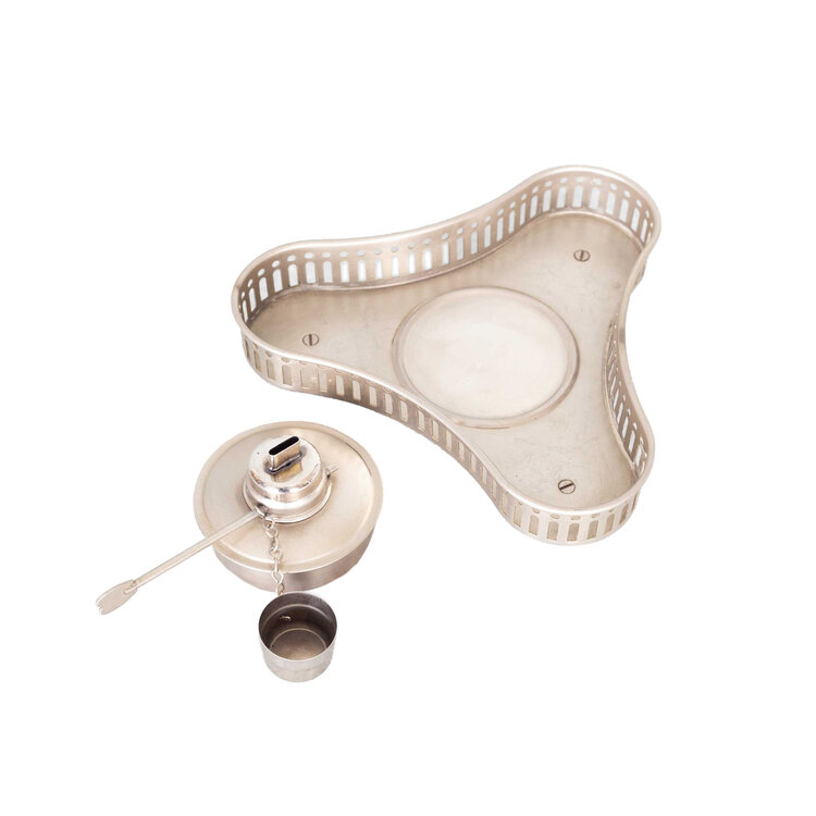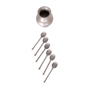 Tinnen keukenset bestaande uit eenkraantjes- of koffiekan, lepelpot met 6 lepeltjes en lepeldoos. Koffiekan, staande op drie poten met kogelvormige onderzijde, gegolfd oor en aan voorzijde kraan. Grillig gevormde onderzetter op drie houten poten. Erop spiritusbrander met vultank en doofdop. Lepelpot, gedrukt bolvormig met ingesnoerde stempelvormige voet en ingesnoerde, naar buiten gebogen rand. Op onderzijde ovaal merk met eromheen 'ZUIVER TIN RIO TIEL HOLLAND'. Erin zes tinnen lepeltjes. Lepeldoos, ronde hoeken en scharnierend oversluitend deksel. Op deksel in relief 'Thee'. Op onderzijde ingeslagen vignet 'KDM 'en eronder 'MADE IN HOLLAND DAALDEROP'. Datering: onbekend. Conditie: prima met hier en daar gebruikssporen en kraantje van de kan mist. Afmetingen: koffiekan 37 x 17 x 17 cm; lepelpot 8,5 x ø 7,5; lepeldoos 4,5 x 11,5 x 9 cm.