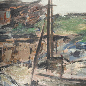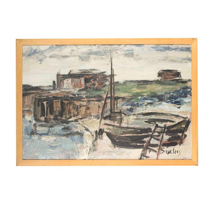 Toon Snijders, Bootje op strand, jaartal onbekend. Olieverf op paneel in houten lijst. Schildering van een bootje op een strand met op de achtergrond gebouwen. Rechtsonder signatuur. Conditie: gebruikssporen en vlekjes op de lijst. Afmeting werk zonder lijst: 40 x 59 cm, incl. lijst 44 x 63,5 cm.