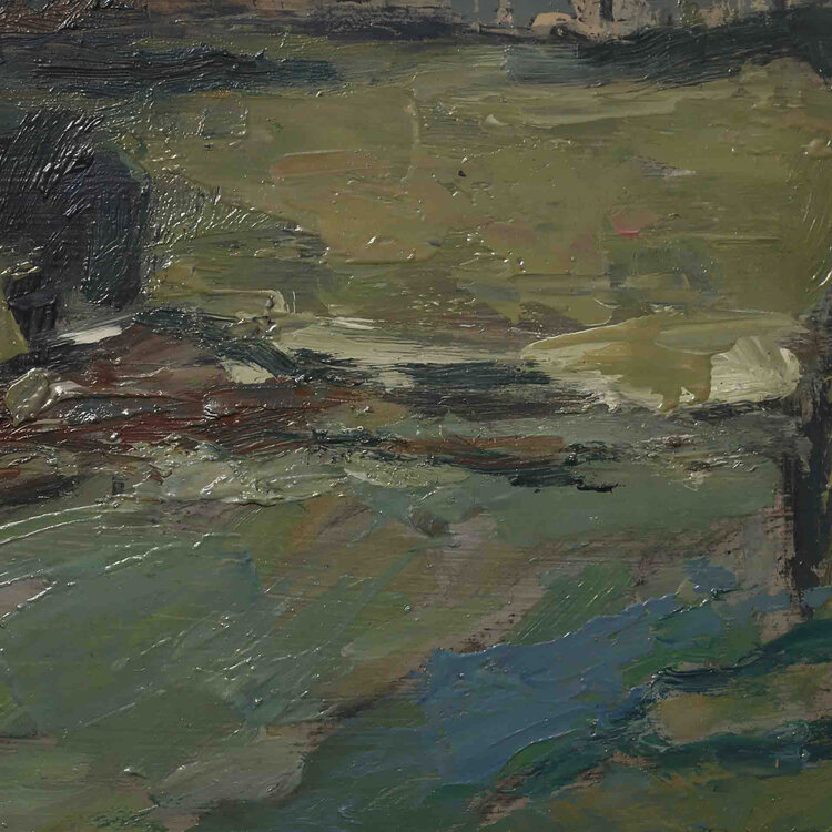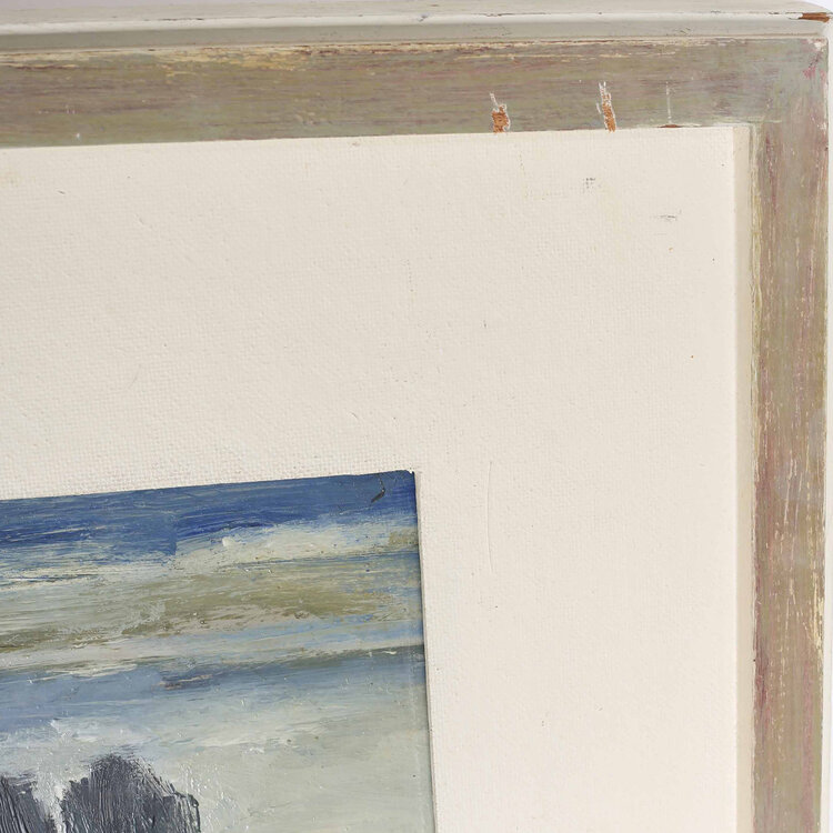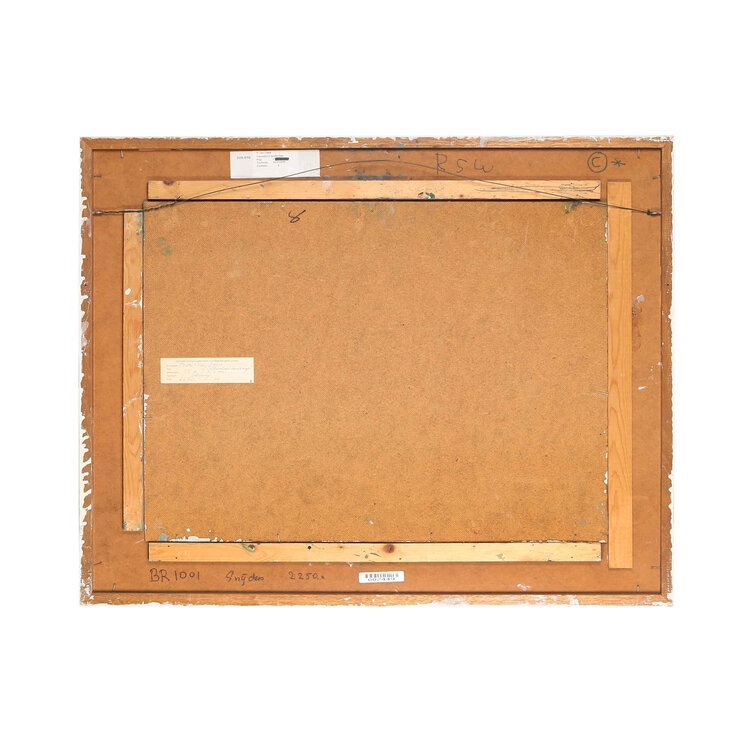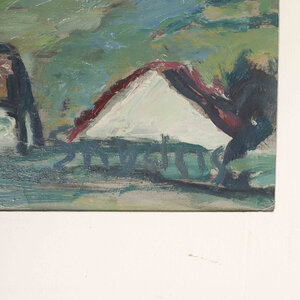 Toon Snijders, Heuvelend landschap, jaartal onbekend. Olieverf op paneel in grijs-wit geverfde houten lijst. Heuvellandschap met groene bomen en huisjes. Rechtsonder signatuur. Conditie: gebruikssporen op de lijst en vlkejes op het passe-partout. Afmeting werk zonder lijst: 50 x 68 cm, incl. lijst: 73 x 92 cm.