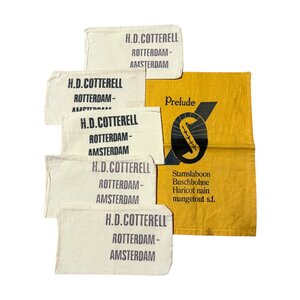 Transportzakjes voor cacaobonen en sperziebonen. Vijf crèmekleurige katoenen zakken met de opdruk 'H.D. Cotterell Rotterdam- Amsterdam'; Een gele katoenen zak met de tekst 'Prelude, Stamslaboon, Buschbohne, Haricot nain, mangetout s.f.'. Datering: 20ste eeuw. Conditie: gebruikssporen.