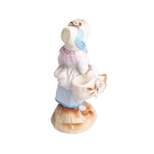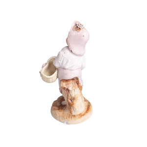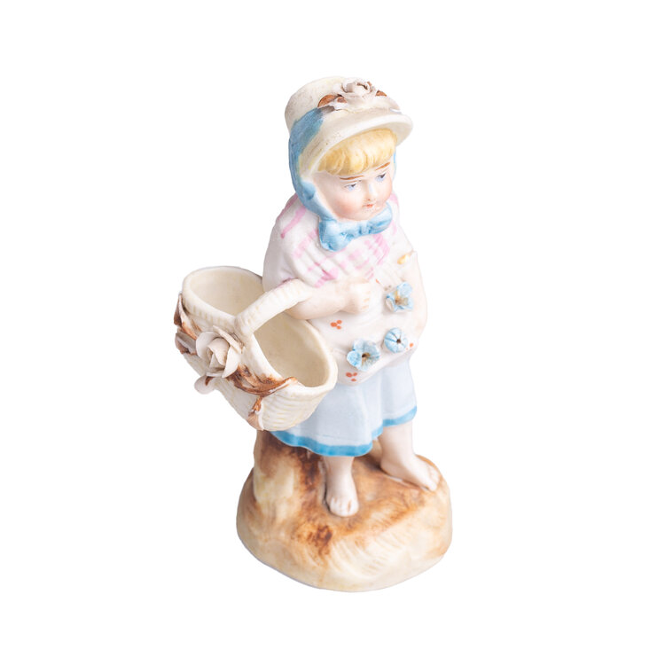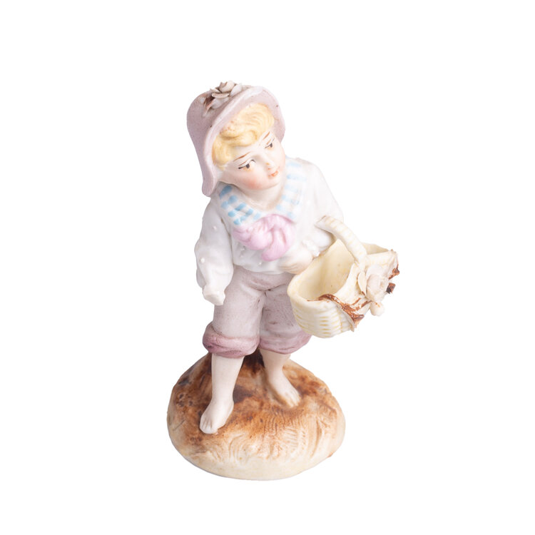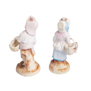 Twee beeldjes van biscuitporselein: meisje met in rechterhand een mandje, met de hand gekleurd in de kleuren blauw-rose. Hoedje voorzien van bruine roos en blauw strikbandje, voetje bruin. En jongetje met in linkerhand een mandje, hoedje voorzien van een roos. Rose strik, wit jasje met blauwgestreepte kraag en lila kuitbroek. Datering: onbekend. Conditie: Rechterarm jongen is afgebroken, beschadigingen aan hoed. Afmetingen: ca. 10 x 5 x 5 cm.
