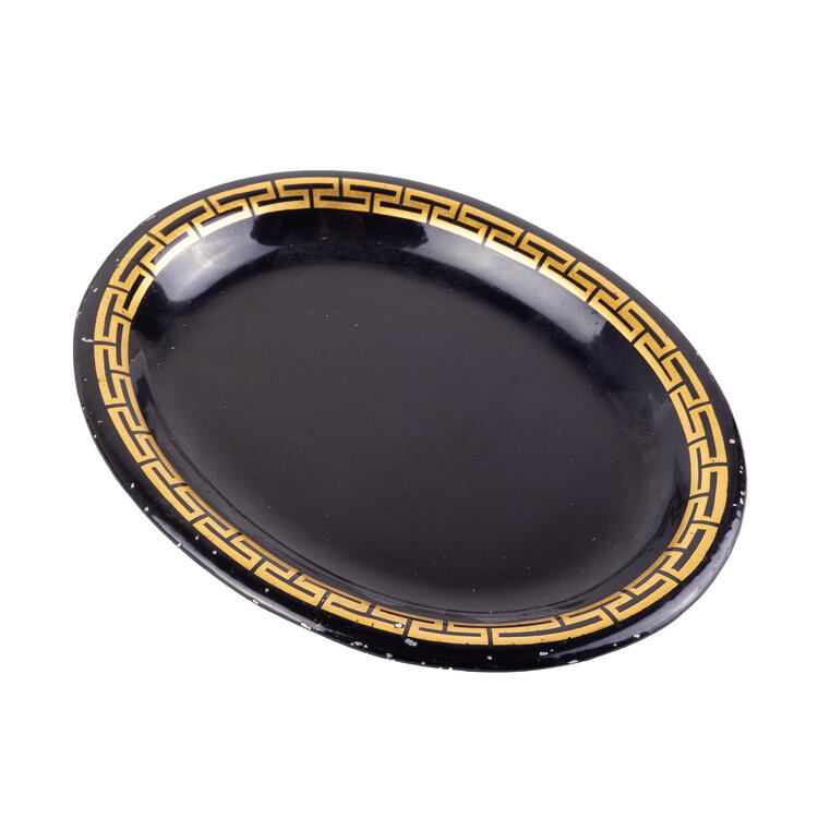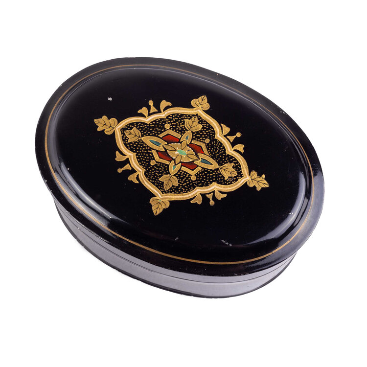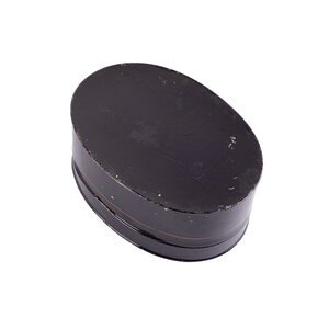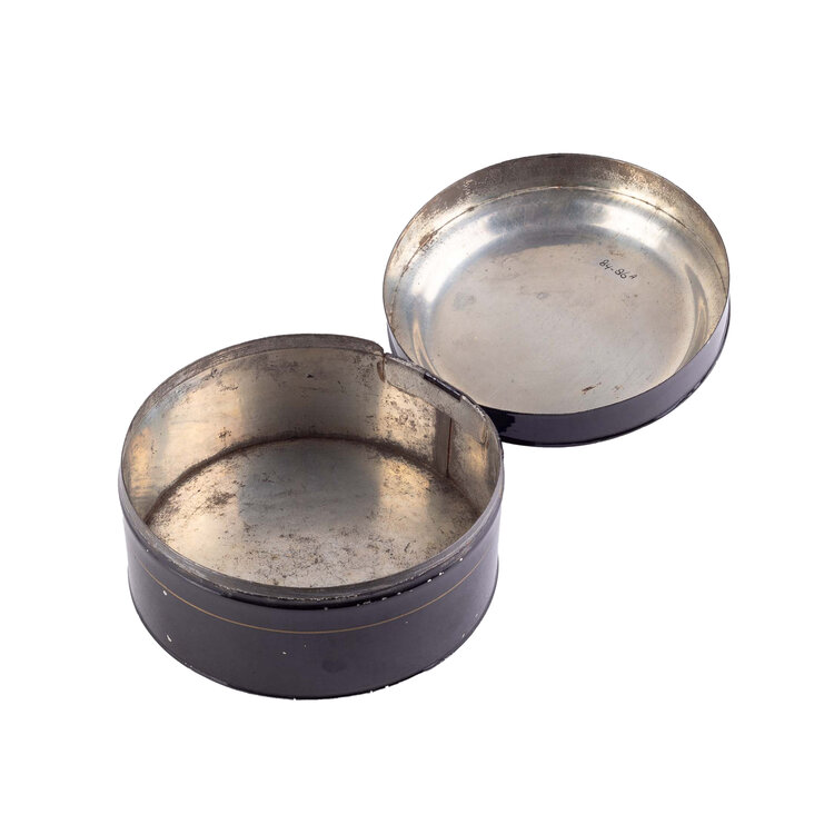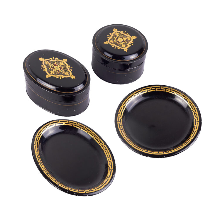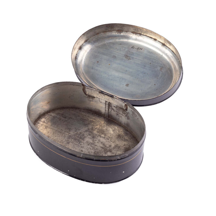 Twee zwart gelakte blikken met gouden opdruk en bijbehorend onderblad. Een ovalen blik en een ronde. Aan de binnenzijde van de deksels gemerkt met het inventarisnummer van het museum. Datering: onbekend. Conditie: op verschillende plekken lakschade, maar nog in mooie staat. Afmetingen: ca. 8 x 20 x 17 cm en 8 x ø 18cm.