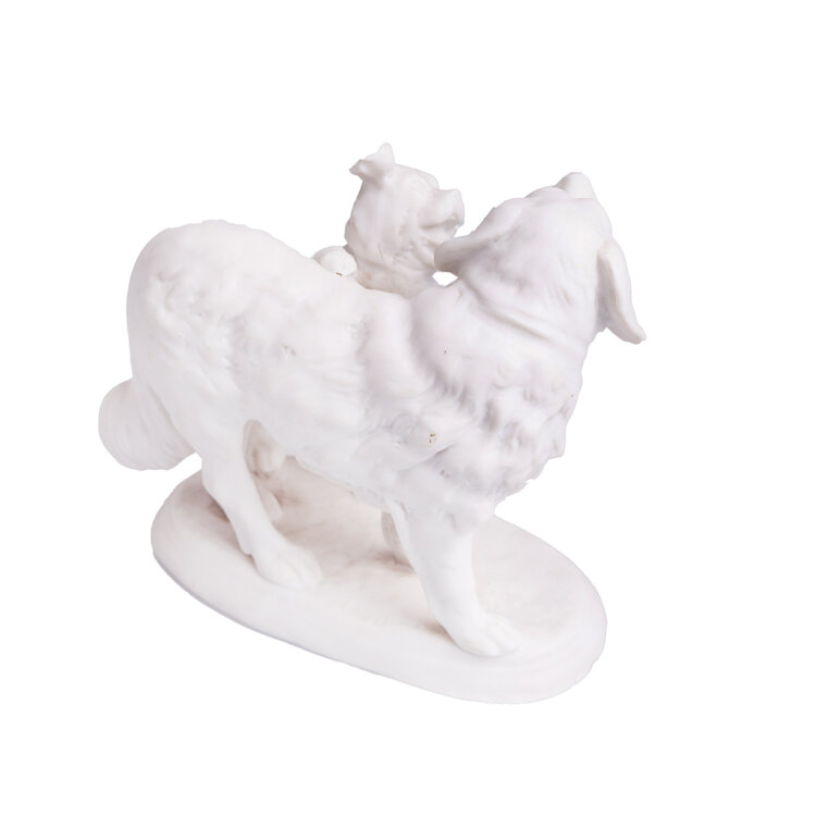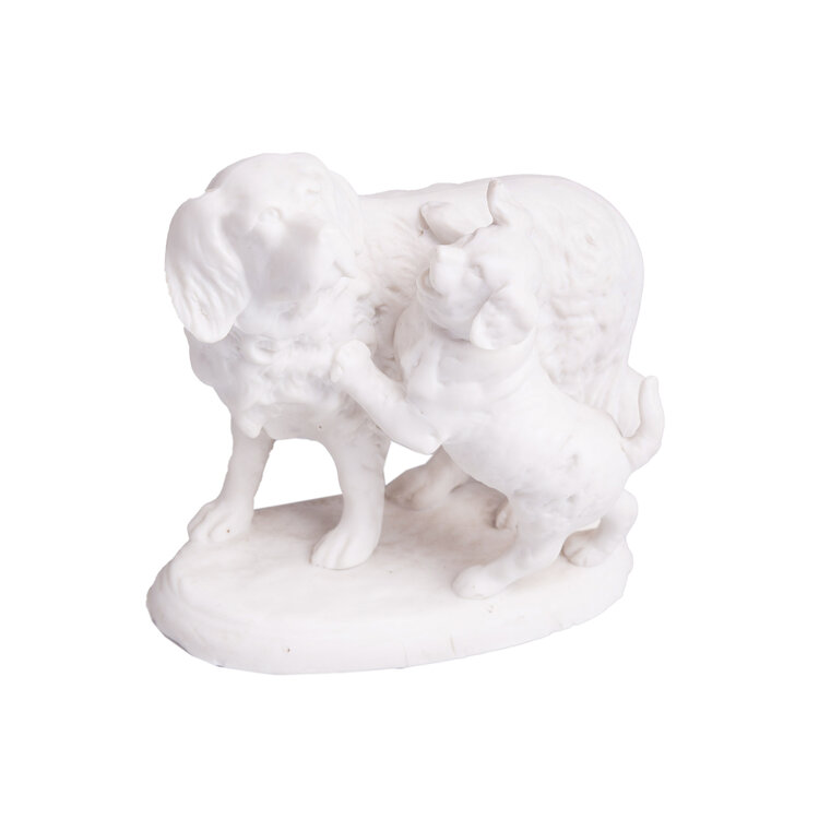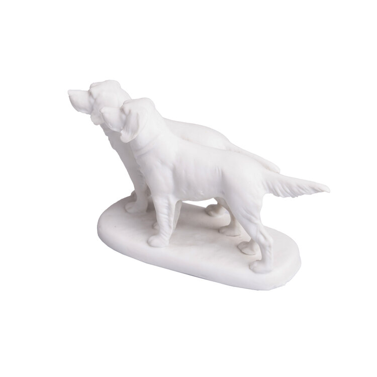 Twee hondenbeeldjes van biscuitporselein. Een beeldje op een ovaal voetstuk met twee staande jachthonden. Een beeldje met een grote labradorhond met tegen hem aanspringende kleinere hond. Beeldjes zijn gemaakt van wit biscuitporselein. Datering onbekend. Conditie: Beide beeldjes zijn in goede staat. Afmetingen: ca. 8,5 x 12 x 5 cm.